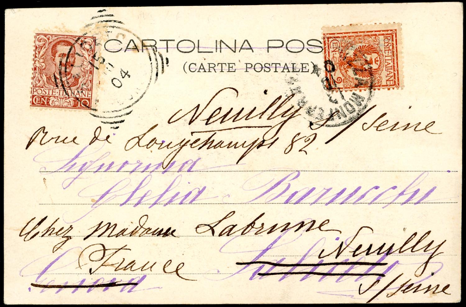 FRANCIA/ITALIA 1904 - Redirected with additional franking.