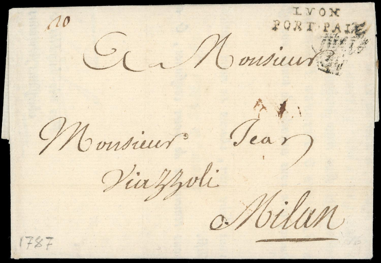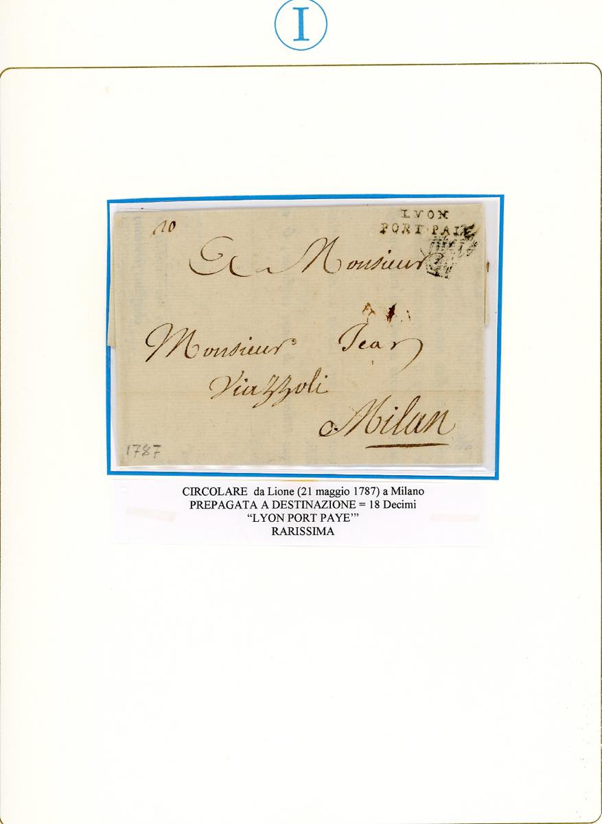 LOMBARDO VENETO-FRANCIA 1787 - Circolare a stampa da Lione 21/5/1787, lineare "Lyon part-paiè", a Milano, al verso la tassa pagata in partenza 16 decimi. Molto rara. Ex coll. Imperato.