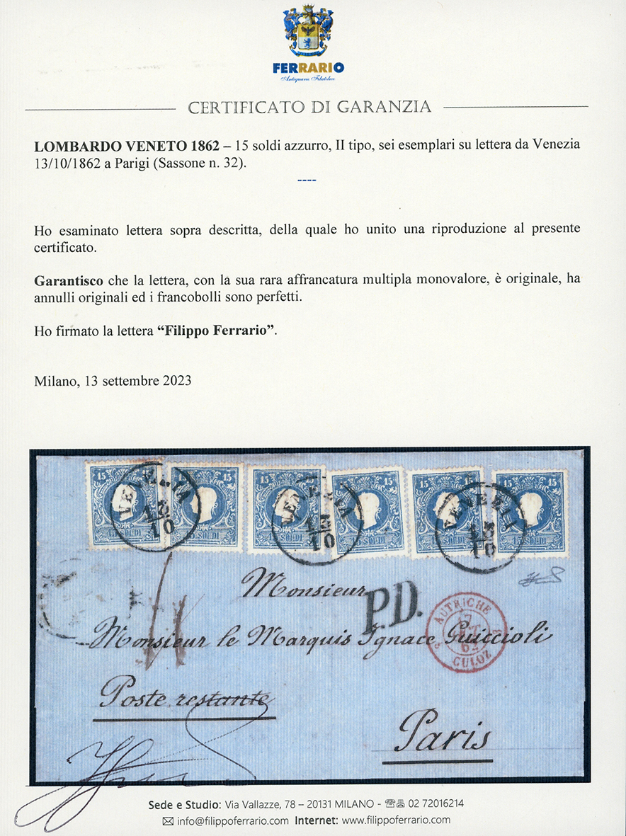 LOMBARDO VENETO-FRANCIA 1862 - 15 soldi azzurro, II tipo (32), sei esemplari, perfetti, su fresca lettera da Venezia 13/10/1862 a Parigi. Molto bella e rara affrancatura multipla monovalore. Cert. Ferrario.