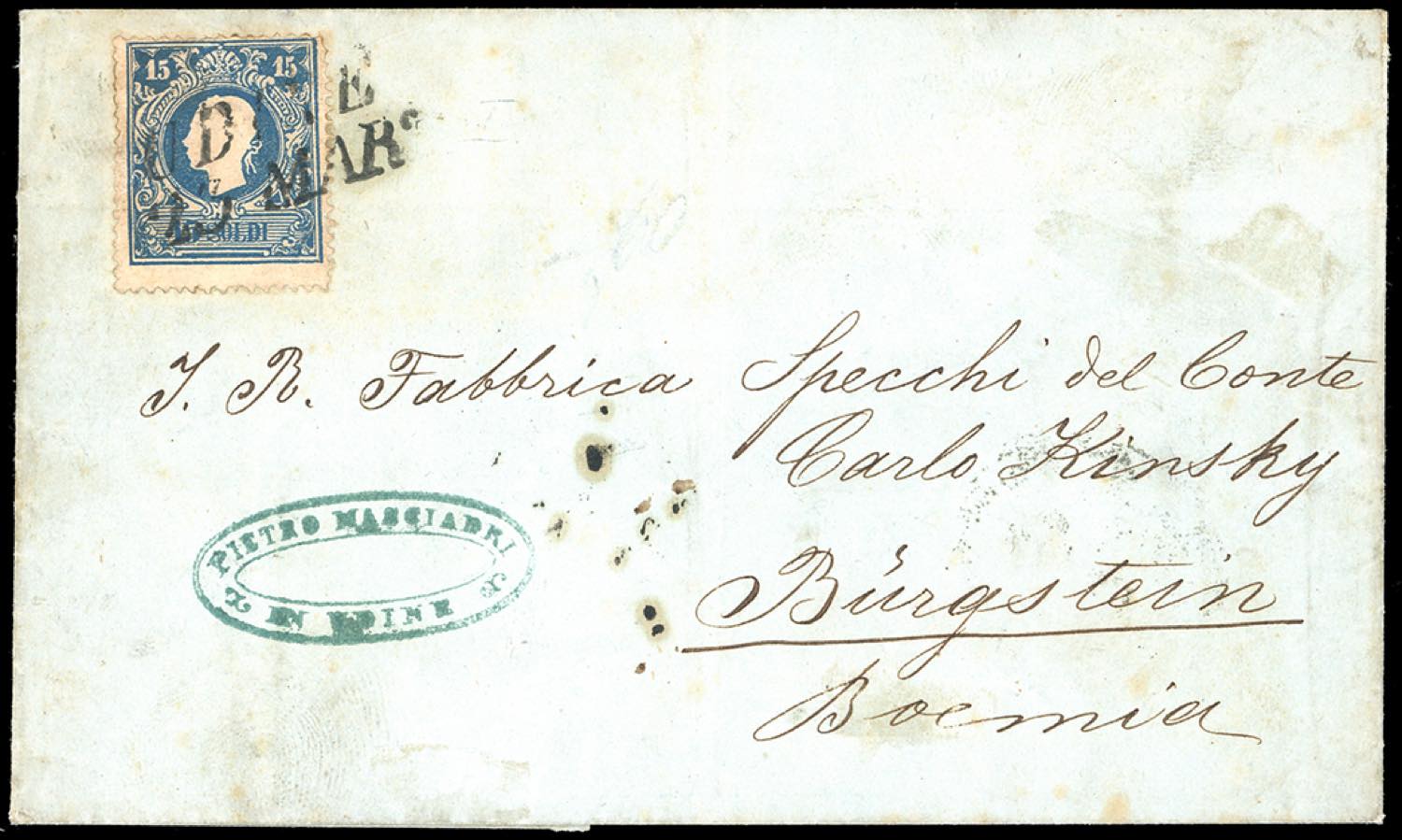 LOMBARDO VENETO-IMPERO AUSTRIACO BOEMIA 1859 - 15 soldi azzurro, I tipo (27), ottimo stato, su lettera da Udine 27/3/1859 a Burgstein, in Boemia. Non comune.