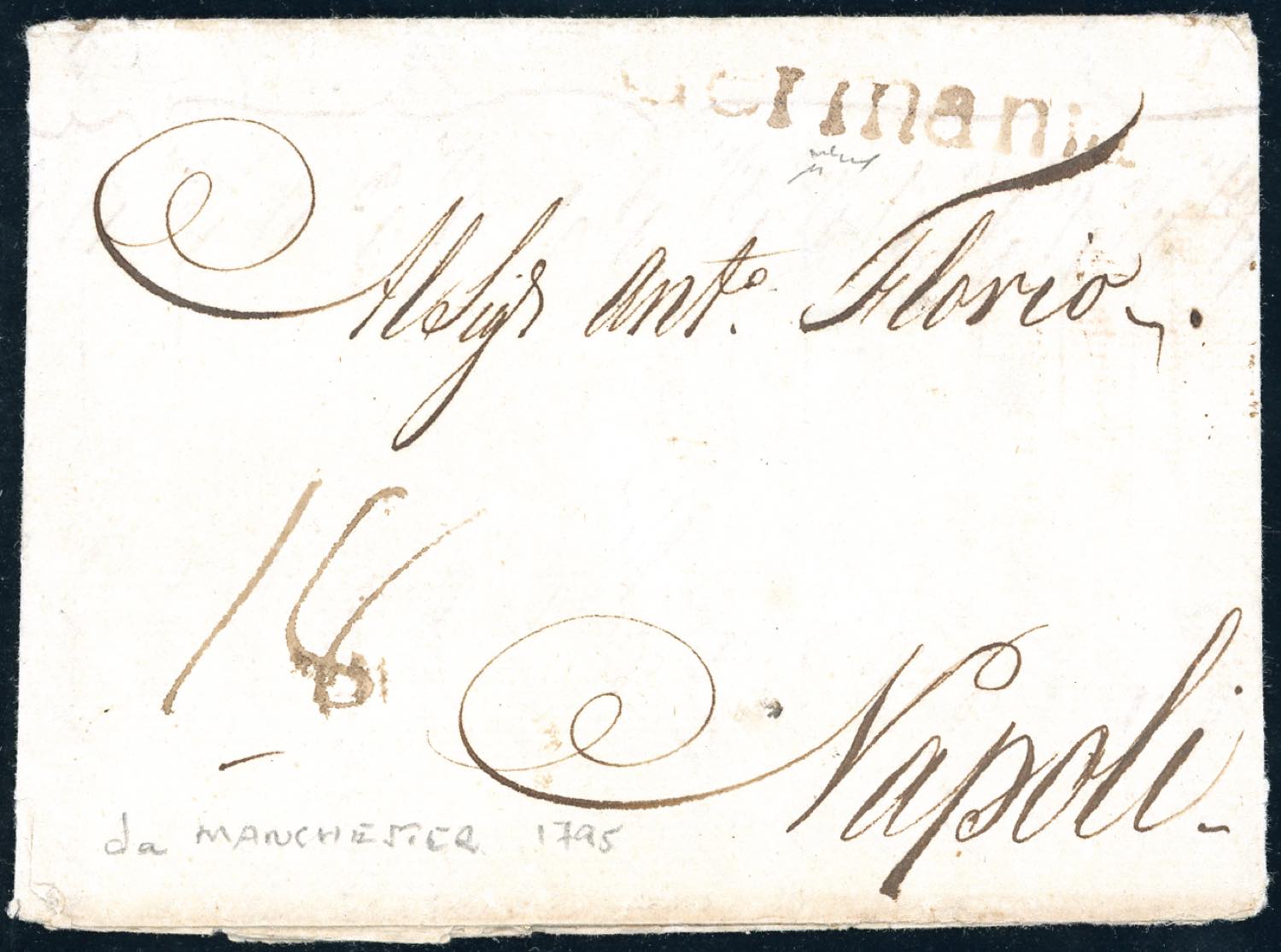 NAPOLI-GRAN BRETAGNA 1795 - Lettera prefilatelica da Manchester a Napoli, tassata 18, sul fronte il lineare bruno acquoso "Germania". Chiavarello. Ex coll. Imperato.