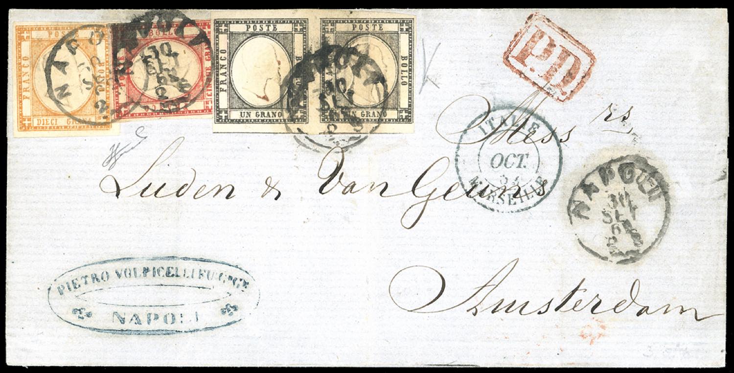 PROVINCE NAPOLETANE-OLANDA 1862 - 10 grana arancio, 5 grana rosso carminio, perfetti, 1 grano nero, coppia, lieve piega verticale (22,21,19), su fresca lettera da Napoli 30/9/1862 ad Amsterdam. Destinazione estremamente rara dalle Province Napoletane, impreziosita dall'uso nell'ultimo giorno di validità ufficiale di questa emissione. Ferrario. Cert. Bottacchi. Ex coll. Imperato.