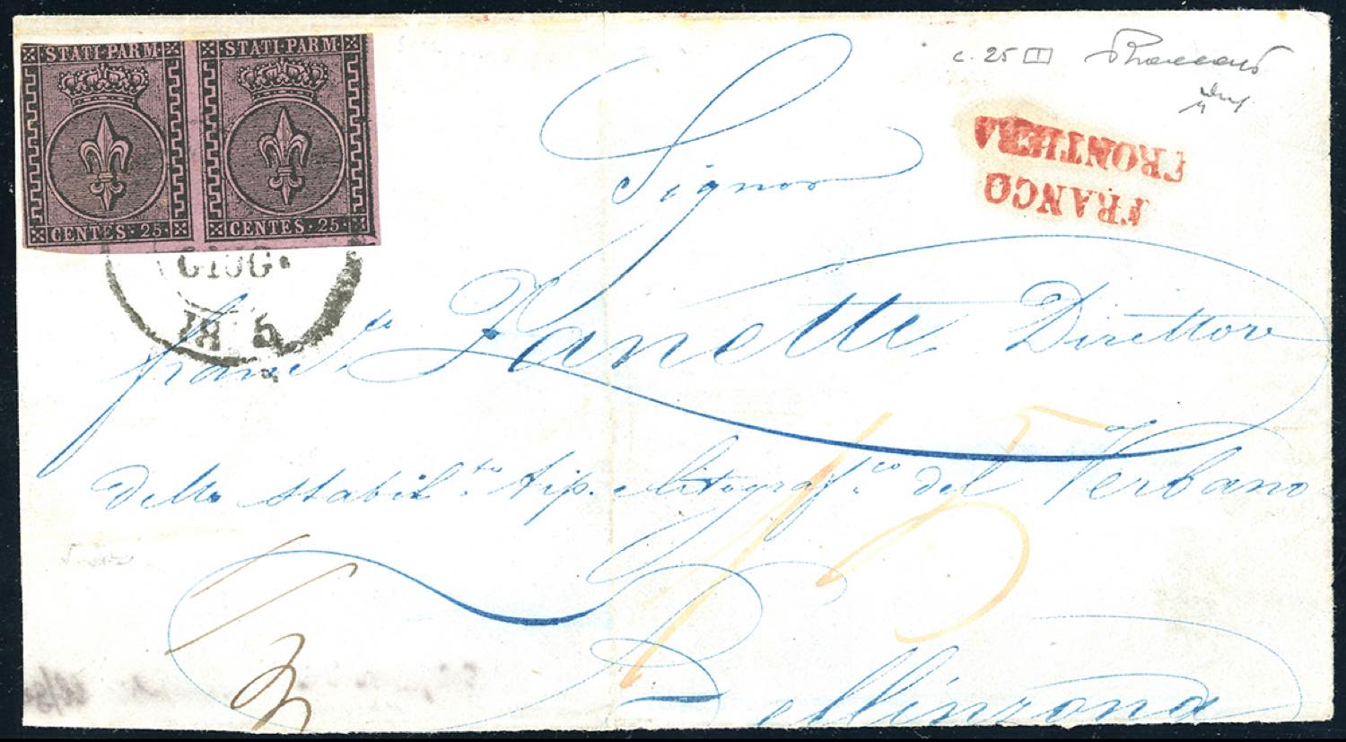 PARMA-SVIZZERA 1852 - 25 cent. violetto (4), coppia orizzontale, su lettera, parzialmente incompleta al verso, da Parma 19/6/1852 a Bellinzona, bollo d'arrivo, affrancata fino al confine per 50 cent. e tassata in arrivo. Affrancatura molto rara e destinazione di pregio. Vaccari, Chiavarello. Ex coll. Imperato.