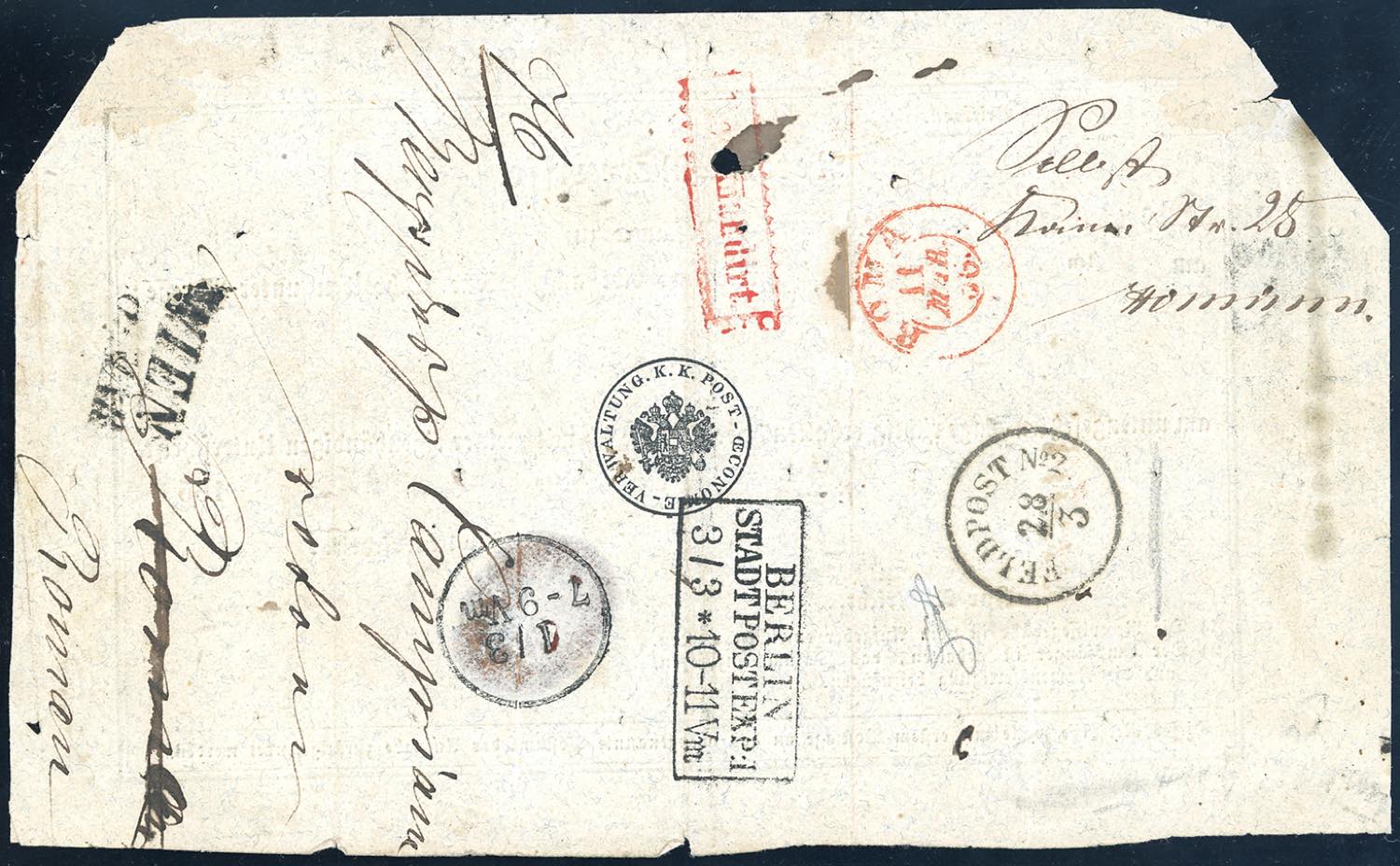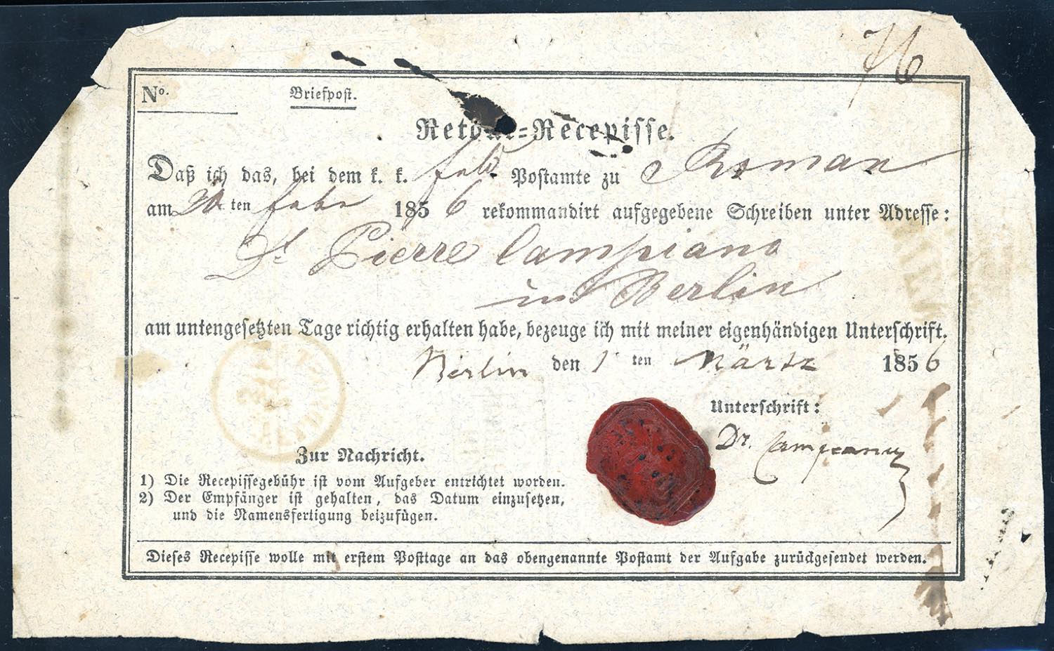 STATO PONTIFICIO-FELDPOST IMPERO AUSTRIACO ROMANIA-GERMANIA 1856 - Ricevuta di ritorno di una raccomandata partita da Roman, in Romania 20/2/1856 a Berlino, dove è giunta l'1/3/1856; il 3/3/1856 la ricevuta viene inviata per errore da Berlino a Roma, transitando per Vienna; accortisi dell'errore di indirizzamento, l'11/3/1856 viene rispedita da Roma alla volta della Feldpost Austriaca n. 2, dove giunge in data 28/3/1856. L'interessante equivoco sulla località di ultima destinazione nasce dalla confusione tra Roman, in Romania e Roma nello Stato Pontificio. Documento molto raro e di grande fascino, anche per la presenza del bollo della posta militare austriaca. Insieme probabilmente UNICO. Dettagliato cert. Ferrario.