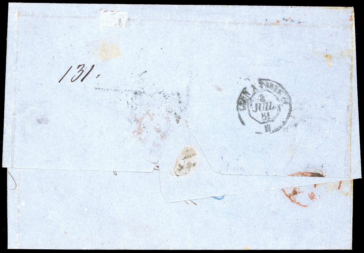 SARDEGNA/SICILIA-OLANDA 1861 - 1 cent. grigio nero per stampati, 80 cent. giallo arancio, 10 cent. grigio olivastro chiaro, due esemplari, 20 cent. celeste (19,17C,14C,15Da), su lettera da Messina 3076/1861 ad Amsterdam, via Marsiglia. Rarissima affrancatura e destinazione per il periodo storico di reintroduzione dei francobolli in Sicilia. Tariffa estremanente rara, applicata in grana convertiti in centesimi. Insieme probabilmente unico. Ferrario.