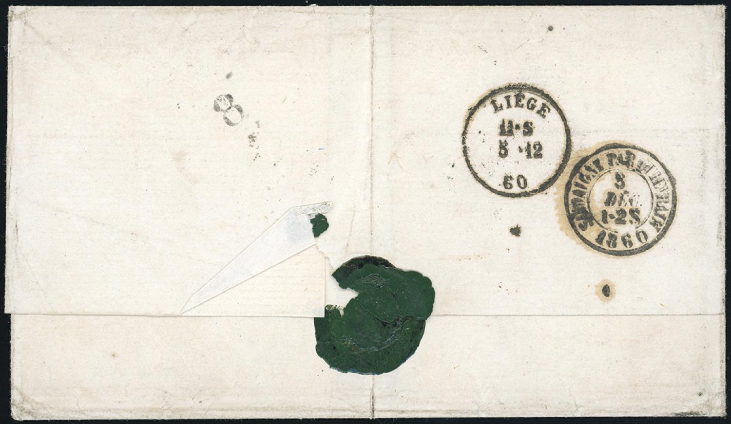 SARDEGNA-BELGIO 1860 - 80 cent, giallo ocra pallido (17A), tre esemplari con lievi difetti, su lettera di quattro porti da Milano 3/12/1860 a Liegi, in Belgio. Eccezionale affrancatura multipla monovalore in esatta tariffa. Insieme probabilmente unico! Cert. Ferrario. Ex coll. Hess.