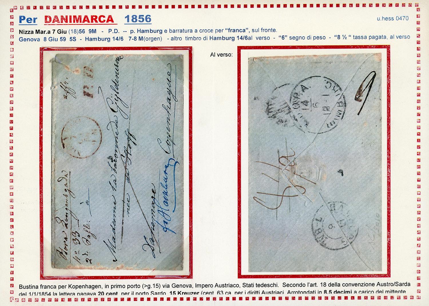 SARDEGNA-DAMIMARCA 1856 - Lettera in porto pagato in contanti da Nizza Marittima 7/6/1856 a Copenhagen, con al verso la tariffa di 8,5 decimi pagati dal mittente. Rara destinazione. Ferrario. Allegata dettagliata descrizione storico postale. Ex coll. Hess.