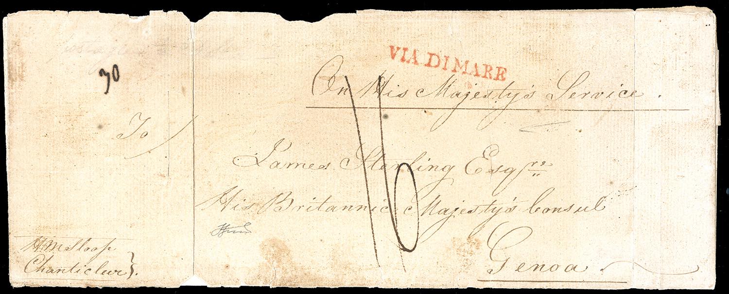 SARDEGNA-GIBILTERRA 1819 - Involucro di lettera, con bel sigillo al verso, spedita da Gibilterra 19/12/1819, via di mare a Genova, viaggiata con il brigantino inglese Chanticleer, tassata 16 cent. in arrivo. La lettera reca anche tagli di disinfezione. Molto interessante e rara. Ferrario. Ex coll. Hess.