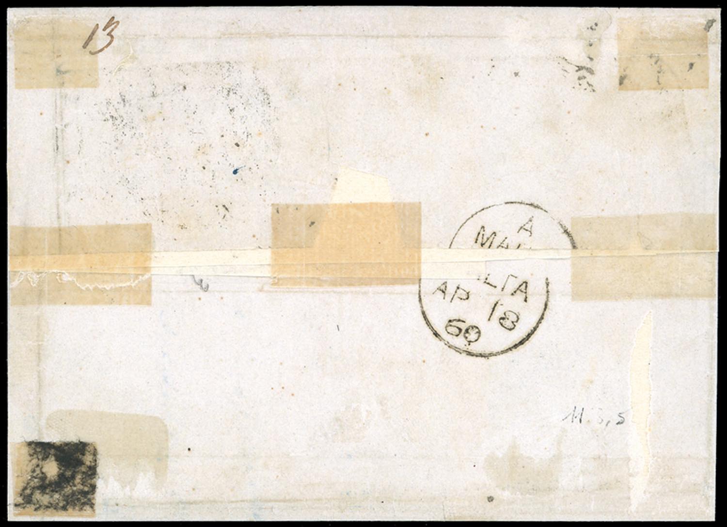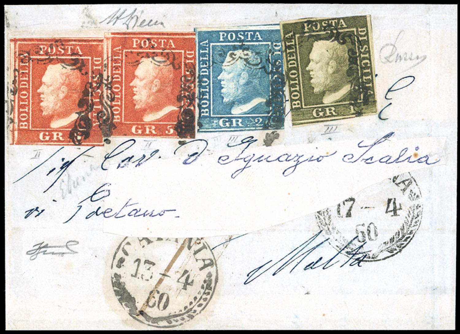 SICILIA-MALTA 1860 - 5 grana vermiglio vivo, II tavola, due esemplari, 1 grano verde oliva chiaro, 2 grana azzurro chiaro, entrambi III tavola (11a,5,8), ottimo stato, su fresca lettera, indirizzo in parte rifatto, da Catania 13/4/1860 a Malta, bollo di arrivo al verso. Estremamente rara, sia per la destinazione che per l'uso multiplo del 5 grana II tavola. Em. ed A.Diena, Russo, cert. Ferrario.