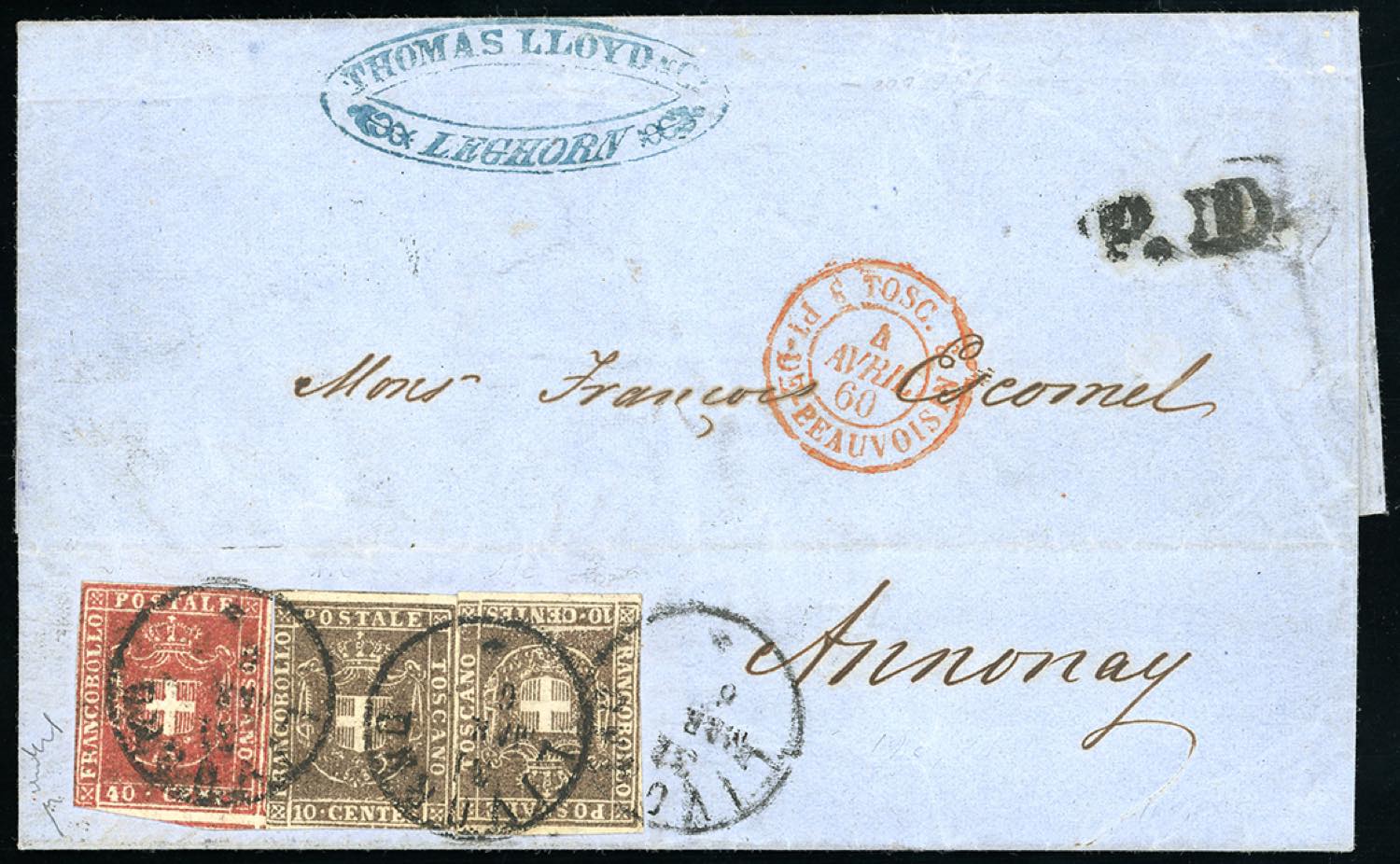 TOSCANA GOVERNO PROVVISORIO-FRANCIA 1860 - 10 cent. bruno, due esemplari, 40 cent. carminio (19,21), alcuni leggeri difetti di marginatura, su fresca lettera da Livorno 31/3/1860 ad Annonay. Affrancatura del tutto insolita. Chiavarello. Ex coll. Imperato.
