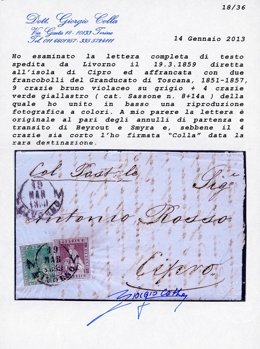 TOSCANA-CIPRO TURCHIA 1859 - 4 crazie verde giallastro, margini intaccati, 9 crazie bruno violaceo su grigio, ottimo stato (14a,8), su lettera da Livorno 19/3/1859 a Cipro, al verso transiti di Smirne e Beirut. Rara destinazione. Cert. Colla.