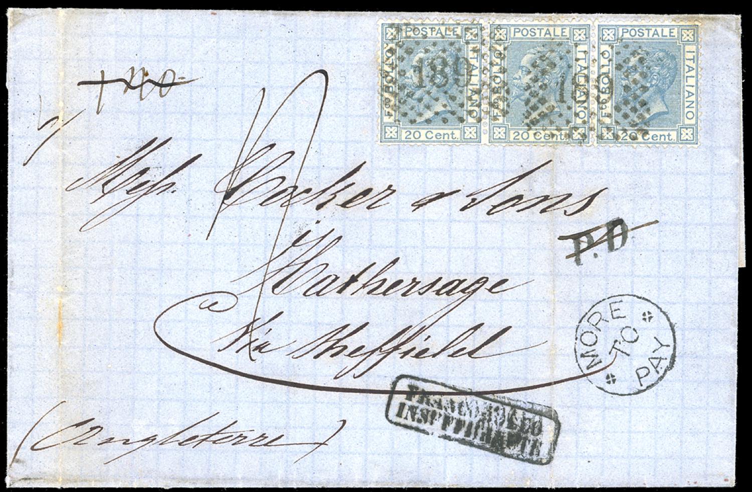 REGNO D'ITALIA-GRAN BRETAGANA 1868 - 20 cent. azzurro, tiratura di Torino (T26), striscia orizzontale di tre, lieve piega verticale sull'esemplare centrale, su lettera insufficientemente affrancata da Torino 2/8/1868 a Sheffield, tassata, bolli "francobollo insufficiente" e "more to pay". Ex coll. Hess.