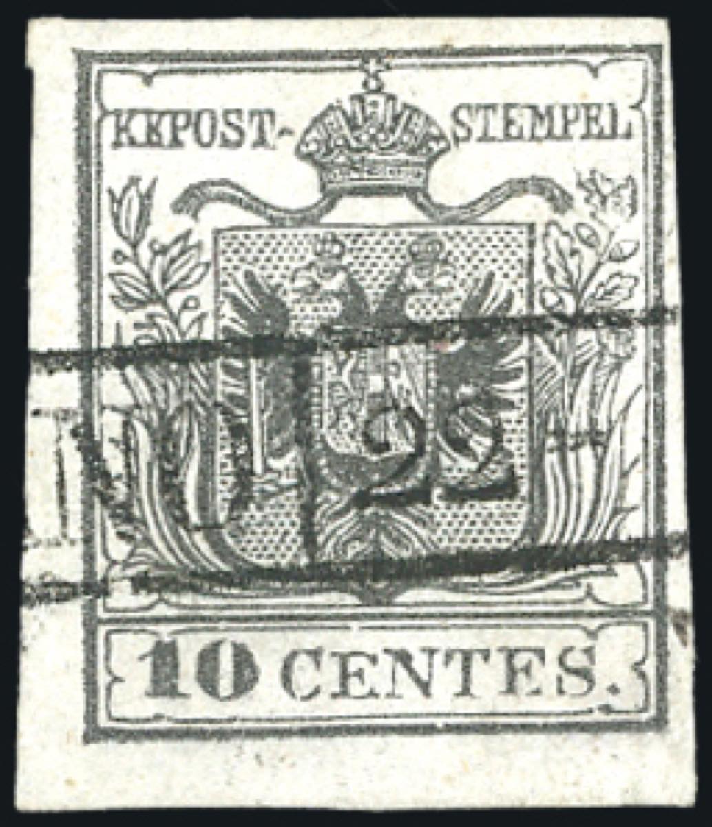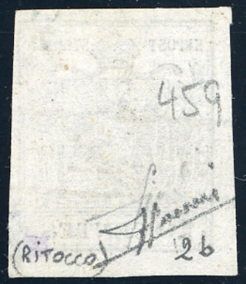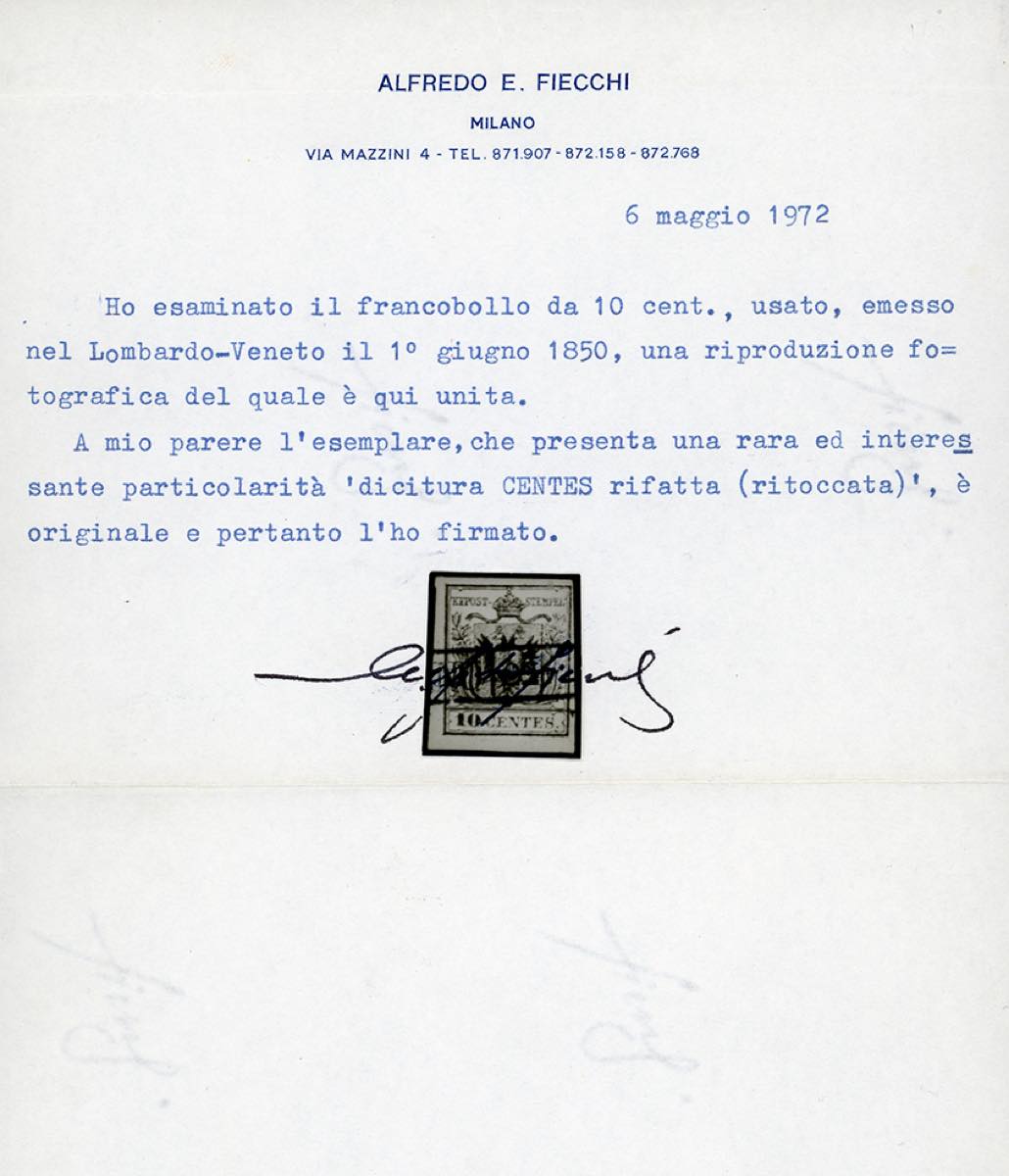 1850 - 10 cent. grigio nero, I tiratura, ritocco della dicitura "centes" (2b/k), perfetto, usato a Milano. Varietà molto rara, specie ... Read more