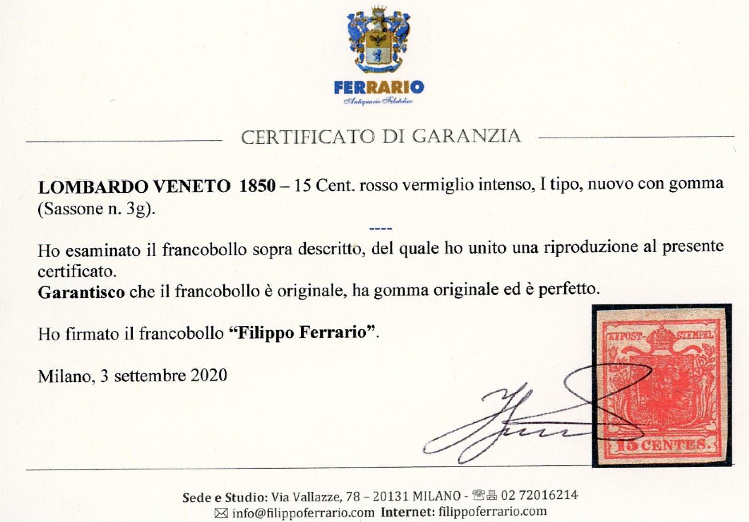 1850 - 15 cent. rosso vermiglio inteso (3g), nuovo, gomma originale, leggera traccia di linguella, perfetto. Molto fresco e ben marginato. ... Read more
