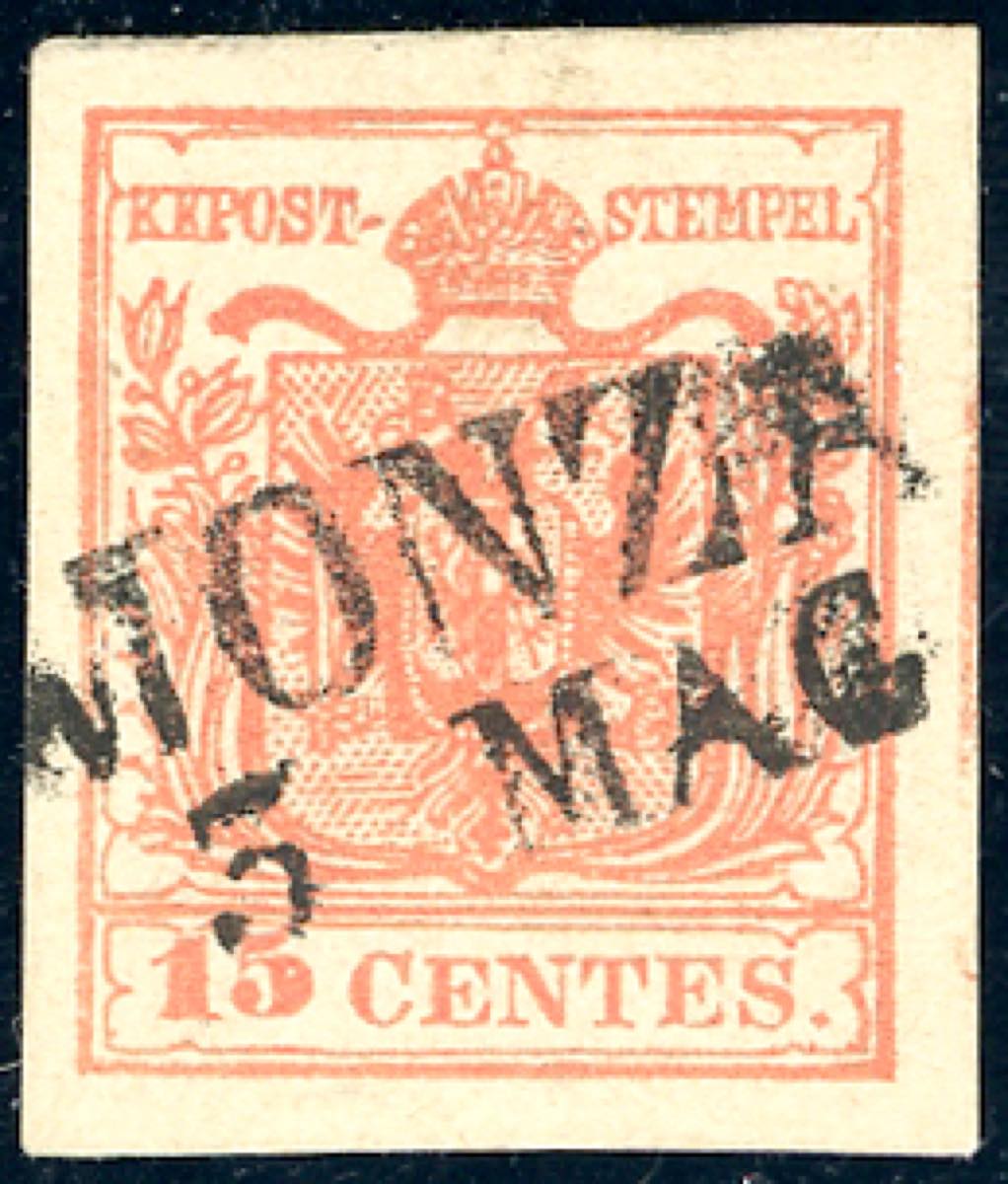1852 - 15 cent. rosso salmone, III tipo, carta a mano, SPAZIO TIPOGRAFICO VERTICALE (6n/d), perfetto, usato a Monza 5/5. Molto raro. Chiavarello, cert. Ferrario.
