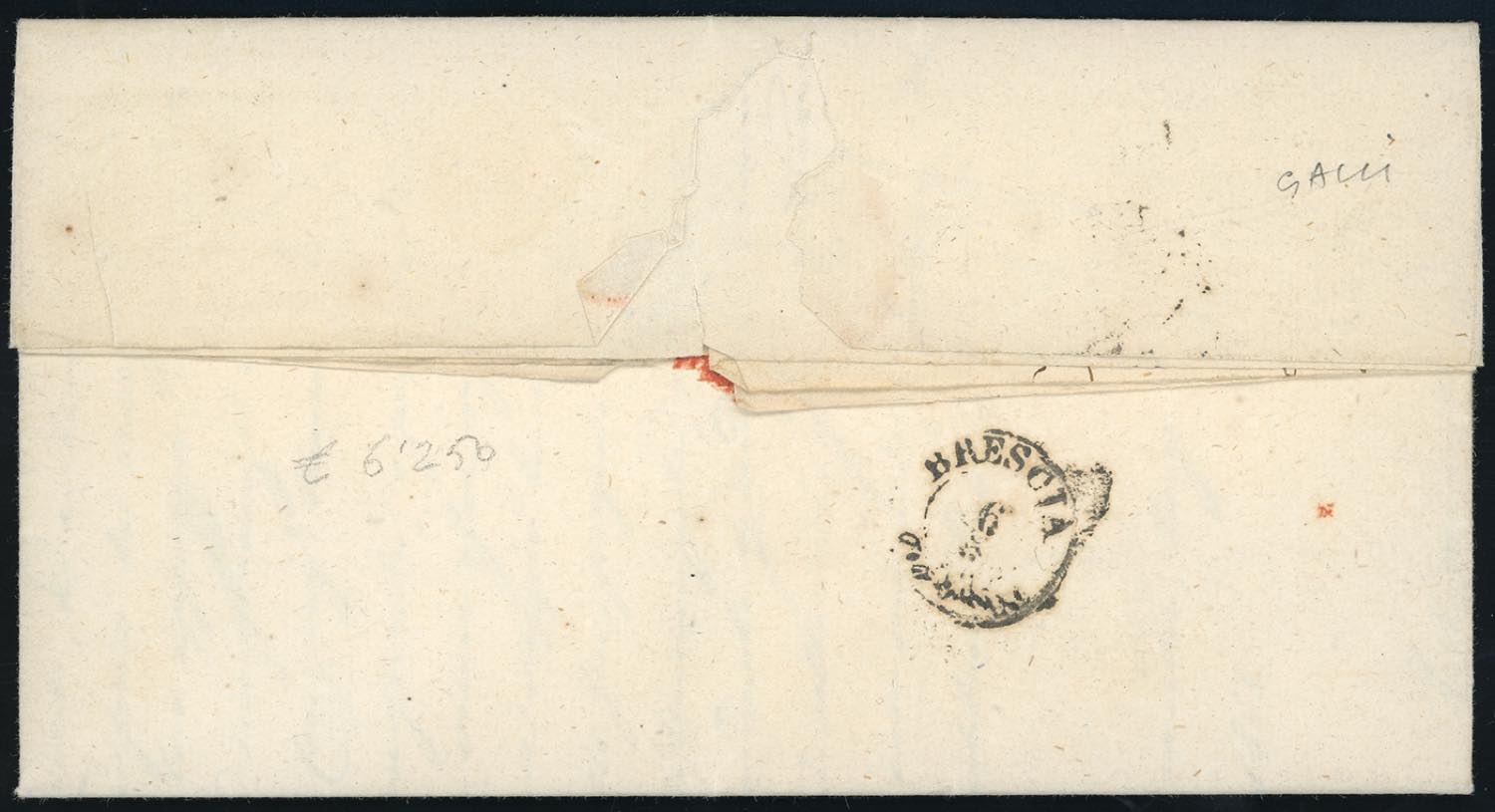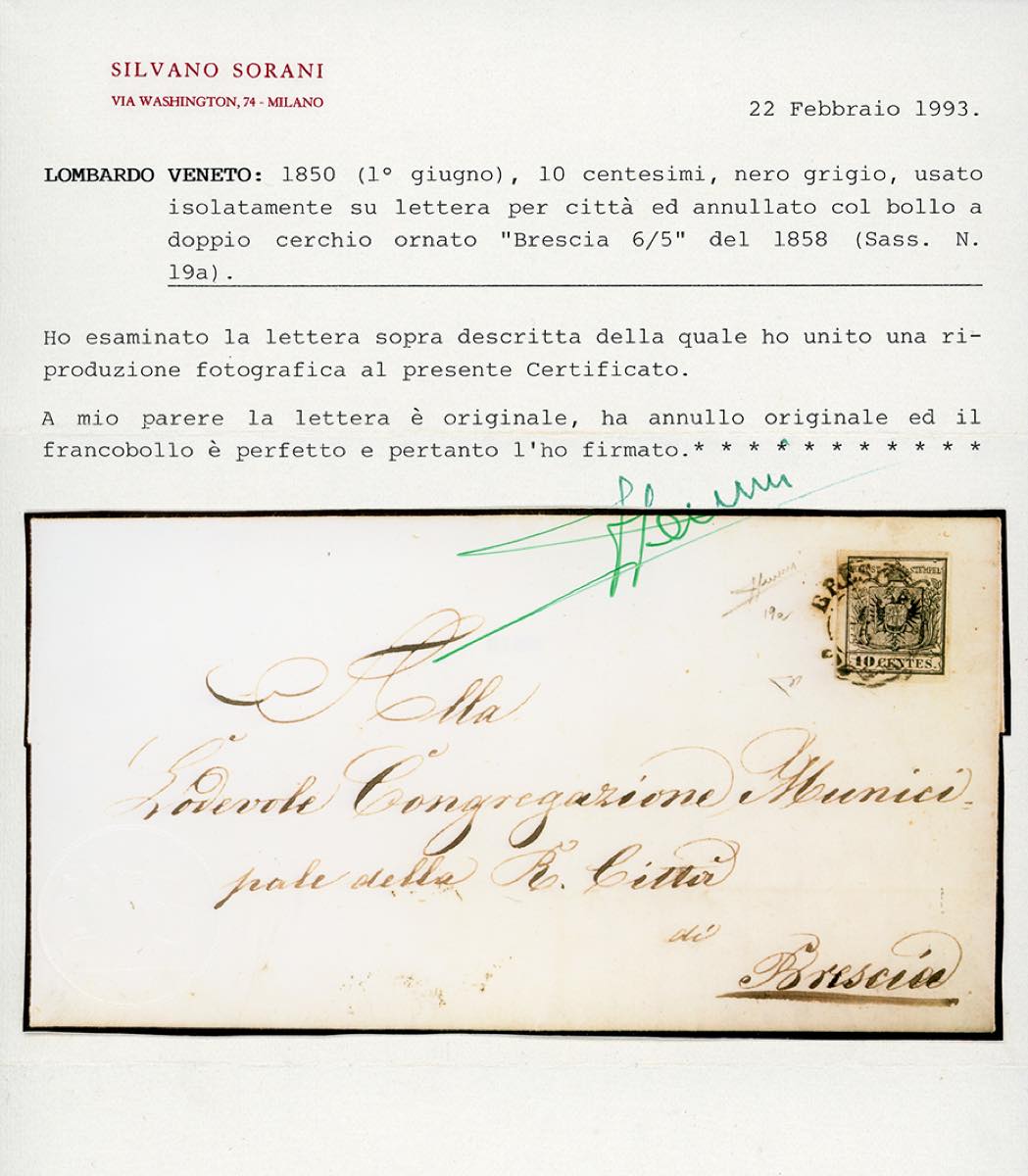 1858 - 10 cent. nero grigio, carta a macchina (19a), perfetto, isolato su lettera da Brescia 6/5/1858 per città. Tariffa pregevole con questo francobollo. Bellissima. E.Diena, cert. Sorani.