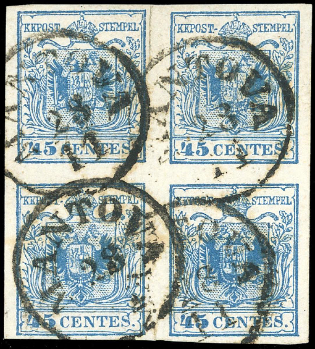 1856 - 45 cent. azzurro, carta a macchina (22), blocco di quattro, usato a Mantova, perfetto. Splendido e raro! A.Diena per esteso, cert. Ferrario.