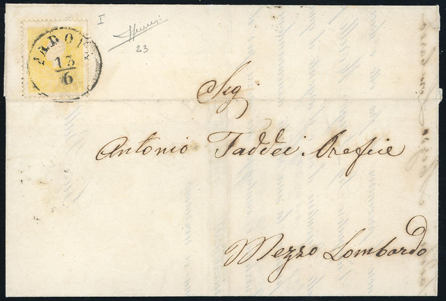 1860 - 2 soldi giallo, I tipo (23), perfetto, isolato su circolare a stampa da Padova 13/6/1860 a Mezzo Lombardo. Cert. Sorani.