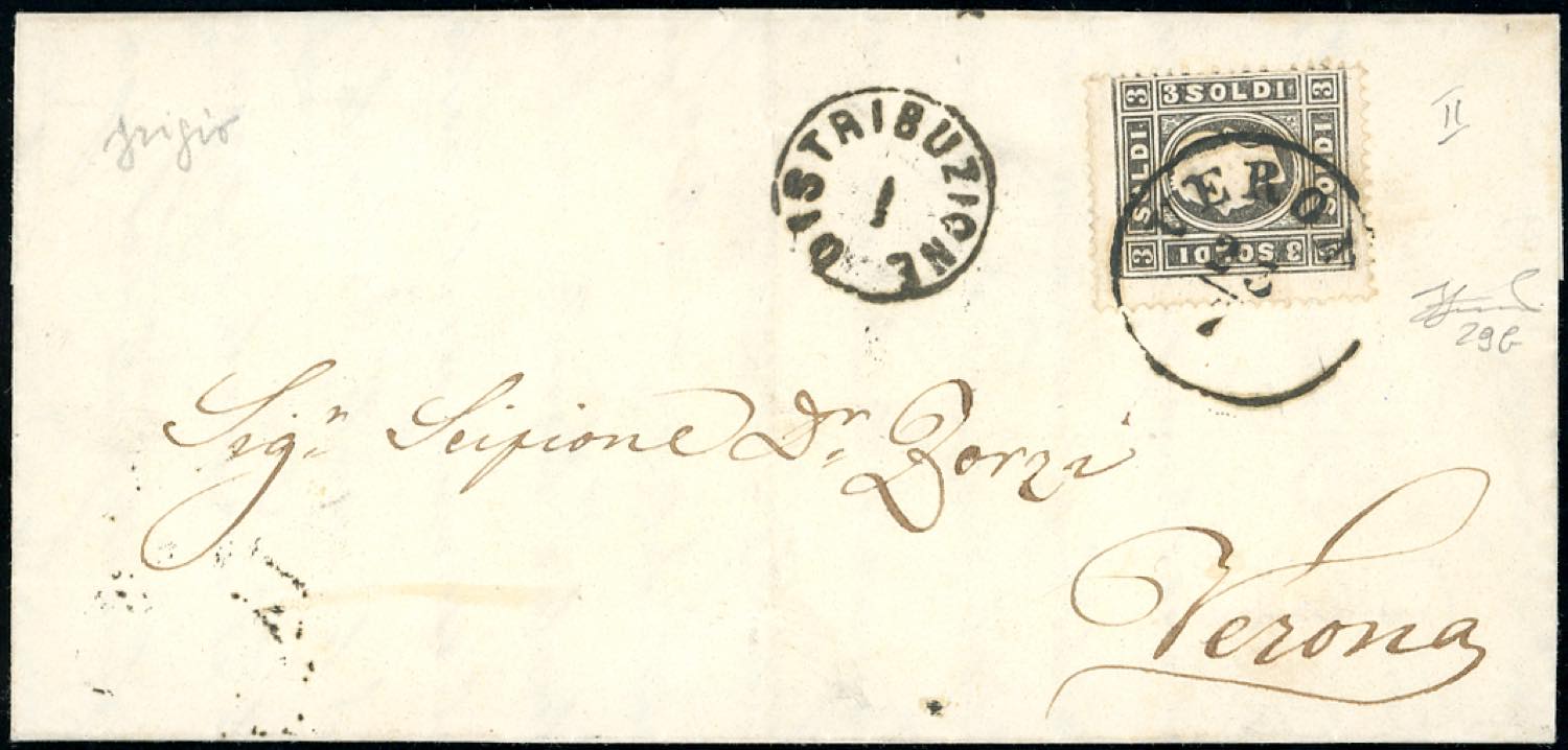 1862 - 3 soldi nero grigio, II tipo (29b), perfetto, isolato su lettera da Verona 23/7/1862 per città. Cert. Ferrario.