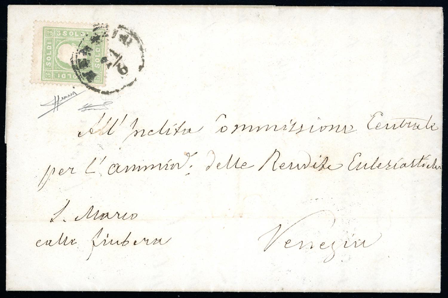 1863 - 3 soldi verde giallo (35), perfetto, isolato su fresca lettera da Venezia 21/6/1863 per città. Molto bella. Sorani, Ferrario.