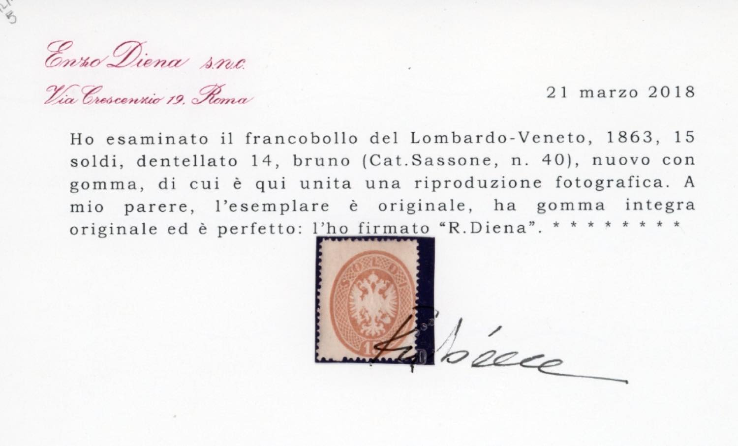 1864 - 15 soldi bruno, dent. 14 (40), gomma originale integra, perfetto. Molto raro! Emilio Diena, cert. Diena.