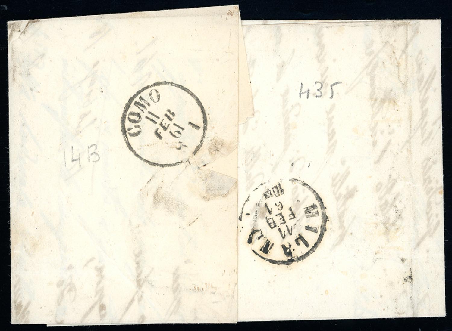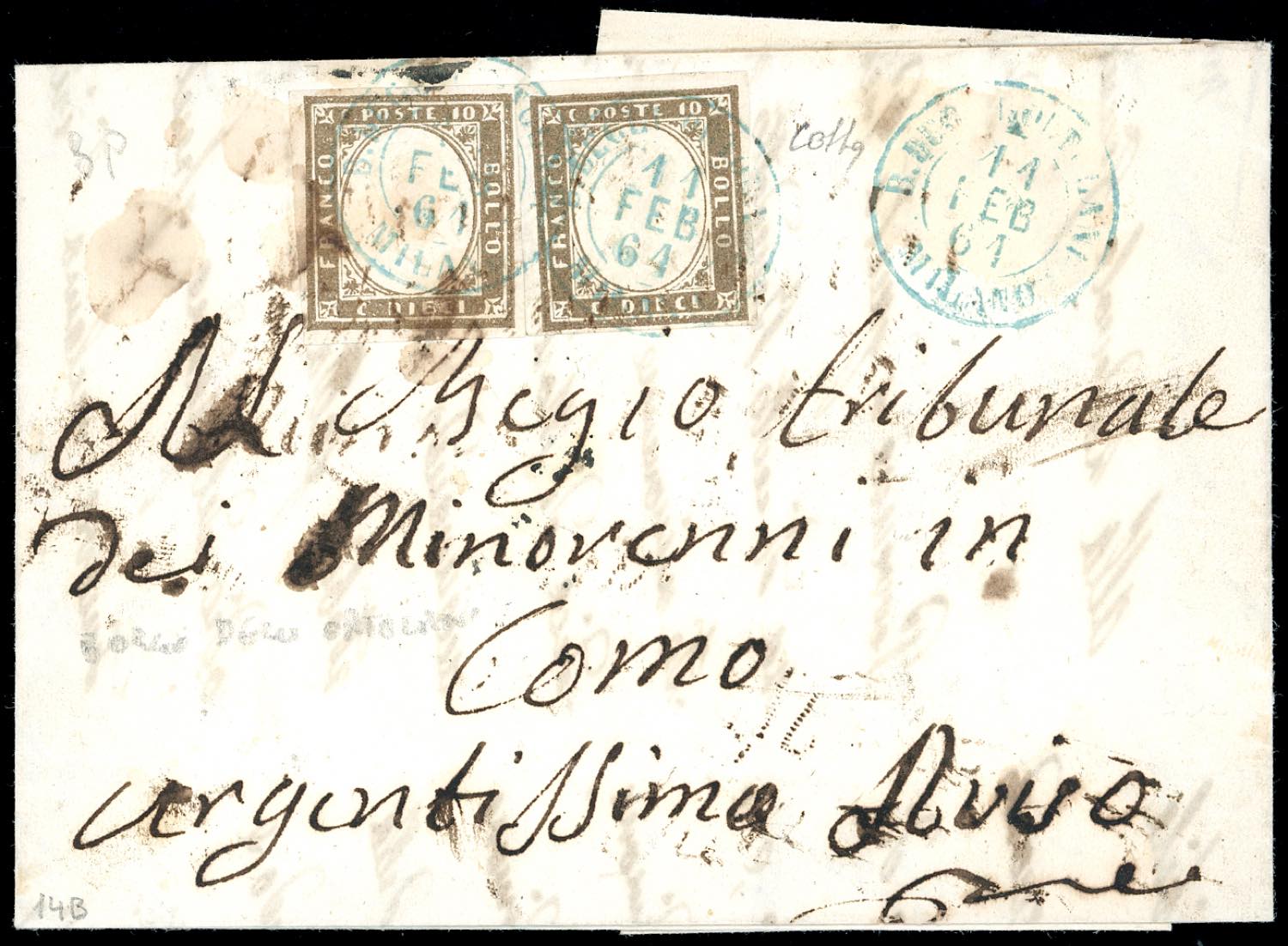 MILANO BORGO DEGLI ORTOLANI, sardo italiano azzurro - 10 cent. bruno grigio olivastro IV emissione di Sardegna (14B), coppia, perfetta, su lettera del 11/2/1862 per Suiso, Como. Raro annullo, quotato dal catalogo Sassone solo sul 20 cent. (12 punti), ma molto più raro sugli altri valori. Cert. Colla.