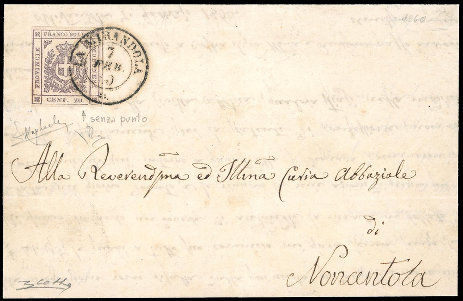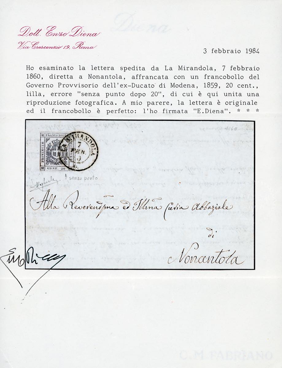 1860 - 20 cent. lilla, senza punto dopo "20" (16a/e), perfetto, su fresca lettera da La Mirandola 7/2/1860 a Nonantola. Splendida e rara. Colla, Raybaudi, cert. E.Diena.