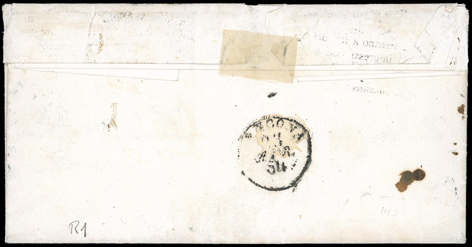 FANANO, 6 sbarre + cartella nero azzurrastro oleoso punti R1 - 15 cent. giallo (3), perfetto su fresca lettera affrancata insufficientemente del 18/4/1854 per Jesi, tassata in arrivo 8 bajocchi. Rara, tonalità intermedia del colore dell'annullo non catalogata. E.Diena, Vaccari.