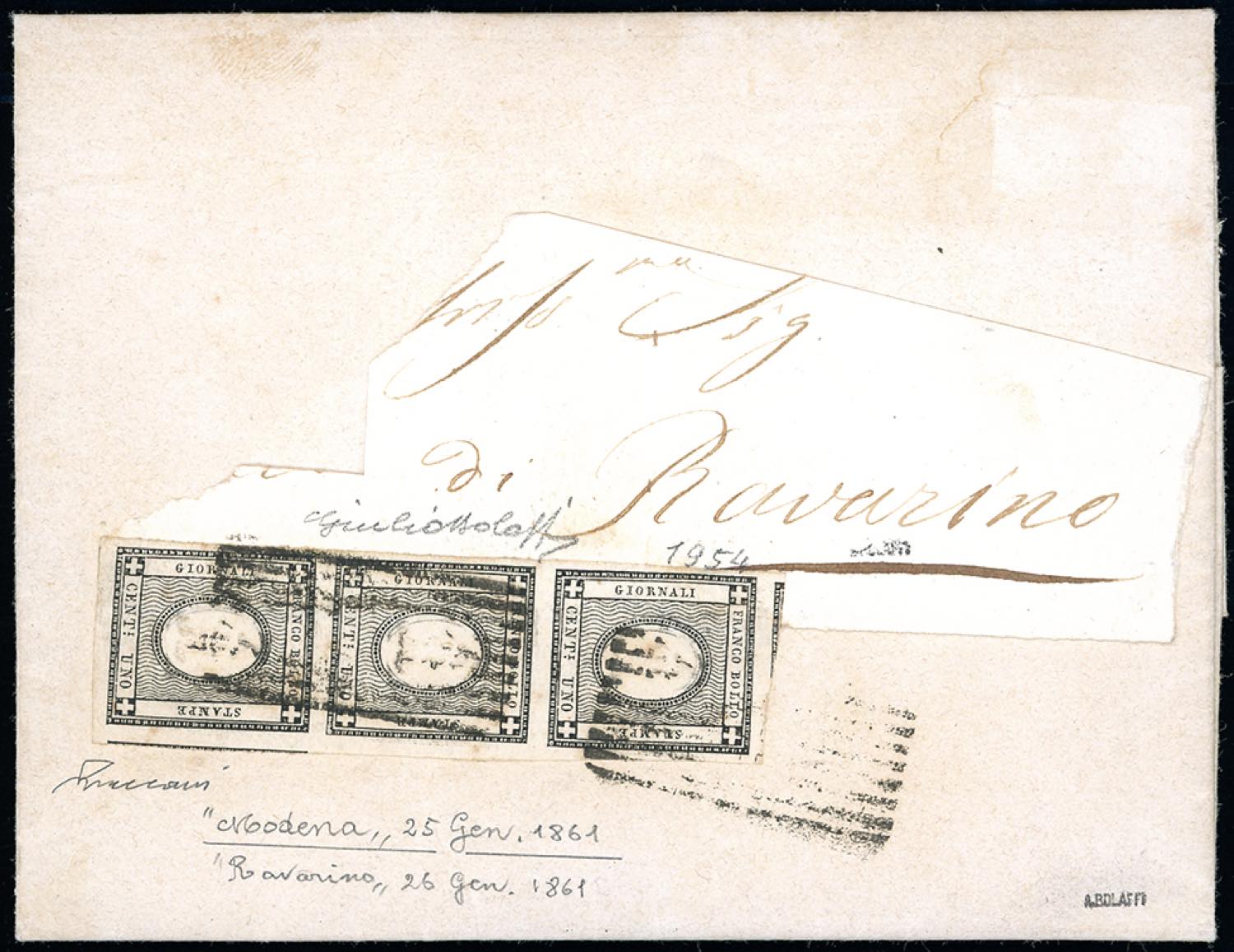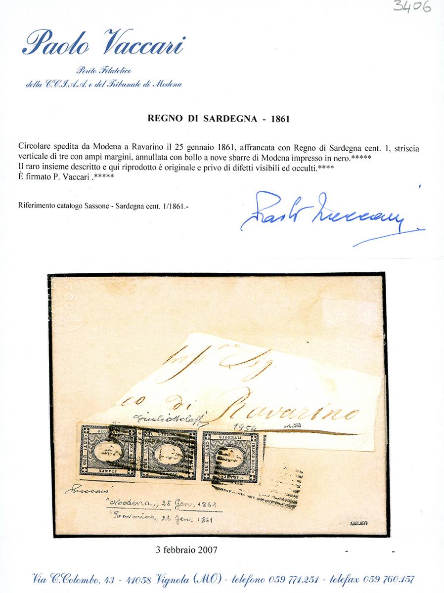MODENA, 9 sbarre punti R2 - 1 cent. nero per stampati di Sardegna (19a), striscia verticale di tre, perfetta e ben marginata, su fresca circolare per Ravarino 26/1/1861. Molto rara e di qualità eccezionale! Insieme unico. Giulio Bolaffi per esteso, cert. Vaccari.