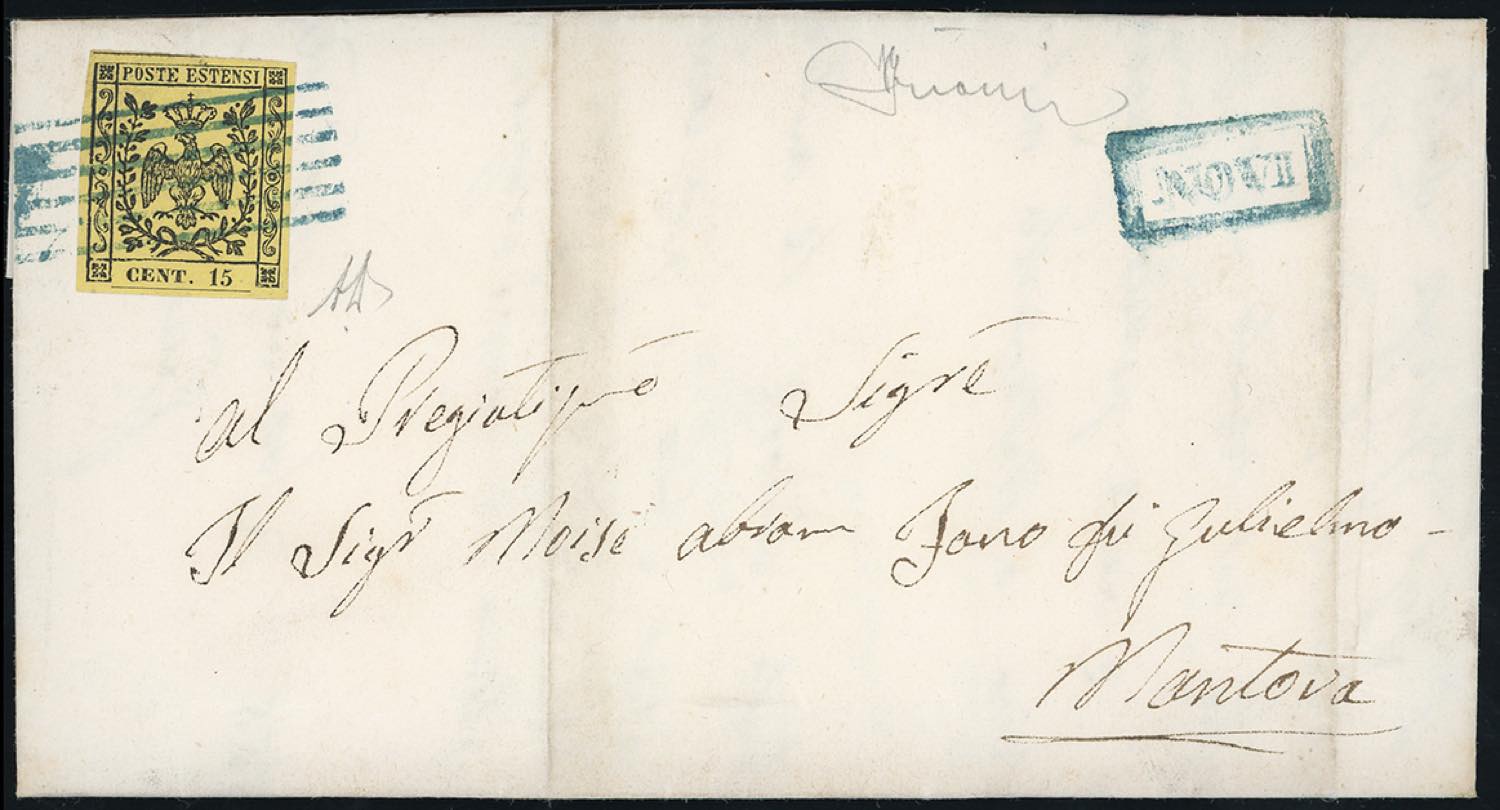 NOVI, sei sbarre + cartella azzurri punti 10 - 15 cent. (3), perfetto, su fresca lettera del 18/3/1858 per Mantova. Grioni, A.Diena.