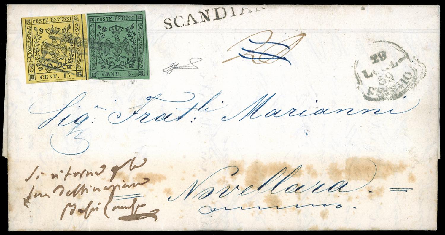 REGGIO, 6 sbarre + campana punti R2 - 15 cent., 5 cent. (3,7), perfetti, su lettera del 29/7/1859 a Novellara. Raro annullamento del Cisappennino in periodo di Governo Provvisorio. Cert. Ferrario.