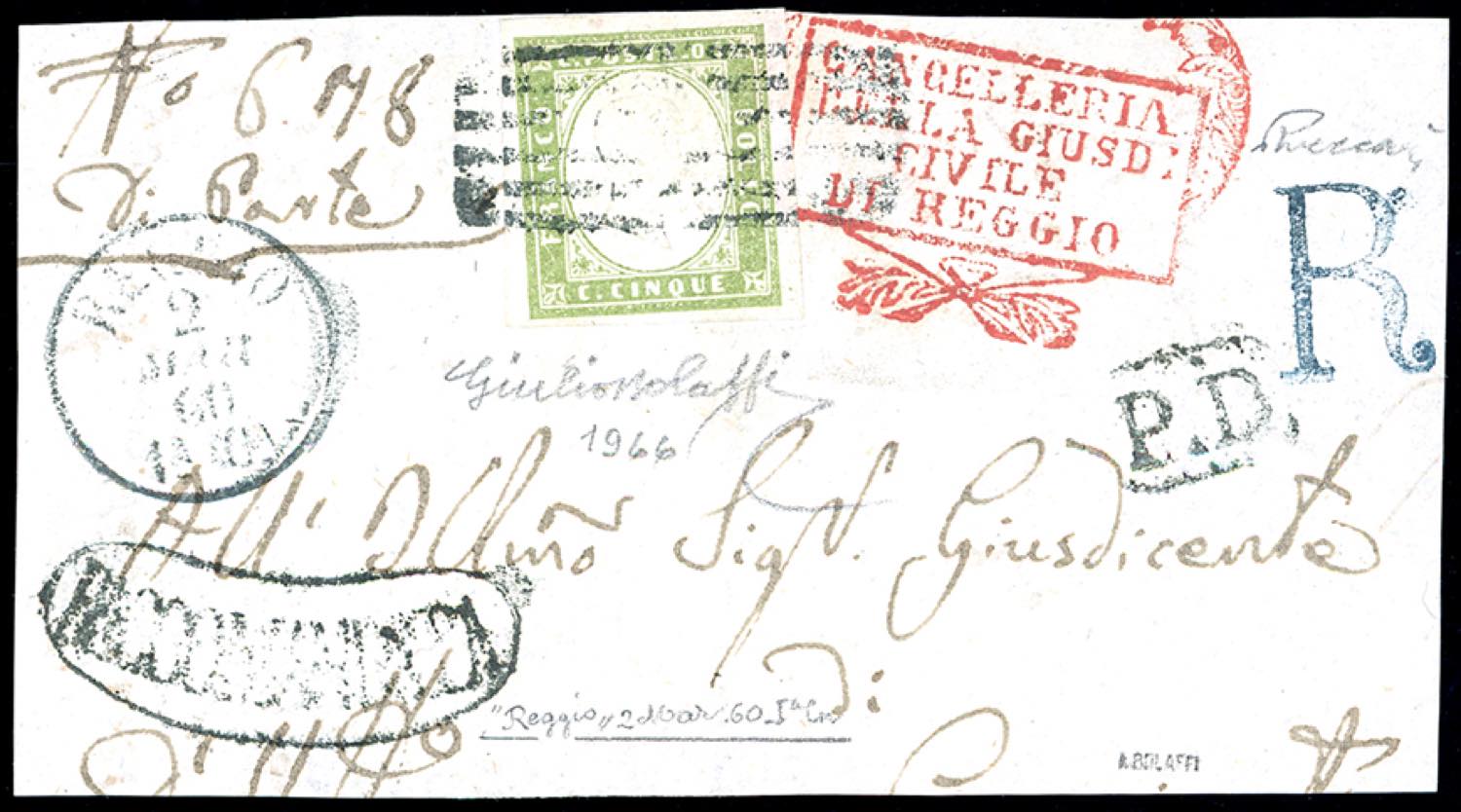 REGGIO, 6 sbarre + cerchio punti 13 - 5 cent. verde oliva IV emissione di Sardegna (13Bc), perfetto e ben marginato, usato su ampio frammento di lettera raccomandata del 2/3/1860. Qualità eccezionale. Giulio Bolaffi per esteso, Vaccari.