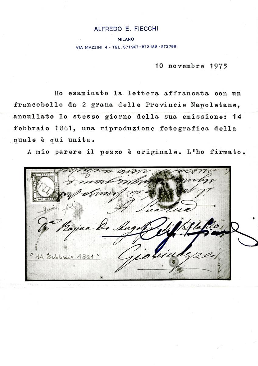 14 FEBBRAIO 1861 - PRIMO GIORNO D'EMISSIONE - 2 grana azzurro (20b), perfetto, su fresca lettera completa del testo interno, bollo "ANNULLATO" lineare, non in cartella, che annulla il francobollo e "PARTENZA DA NAPOLI 14 FEB.1861" rosso al recto, diretta a Giovinazzo. Si conoscono pochissime lettere del primo giorno d'emissione, questa ha il pregio di avere il francobollo perfetto ed un insolito bollo annullatore. INSIEME UNICO E RARITA' DELLE PROVINCE NAPOLETANE. Cert. Fiecchi, Sorani e Ferrario.