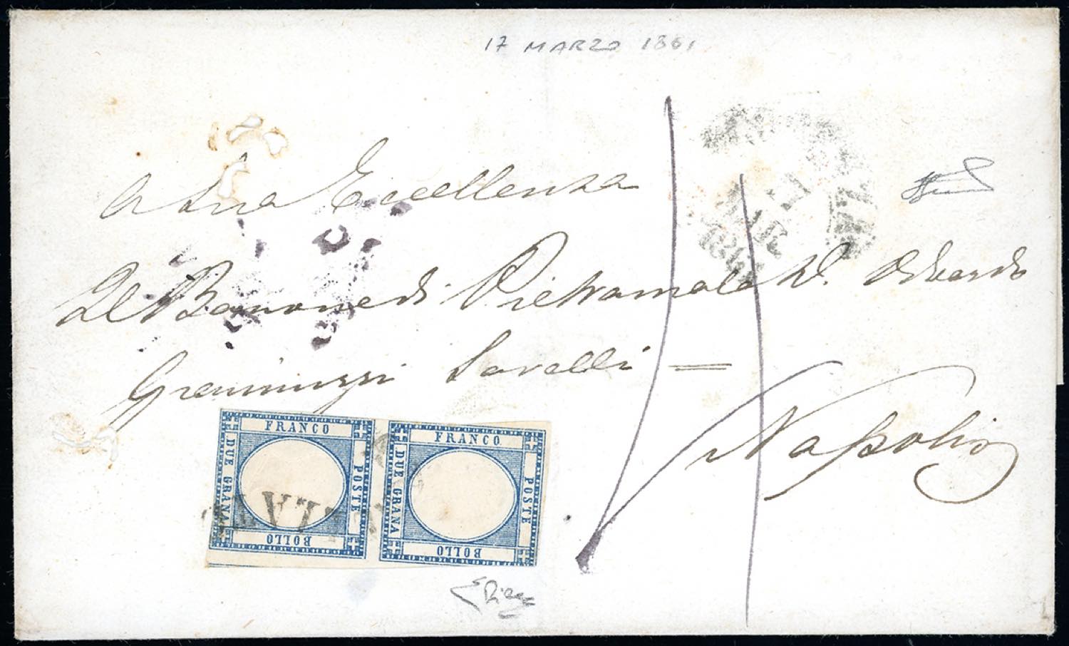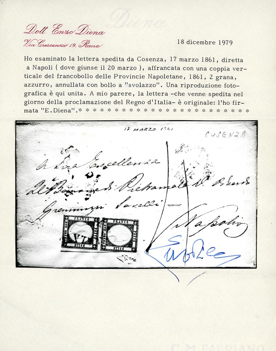 1861 - 2 grana azzurro (20b), coppia verticale, tagliata irregolarmente, su lettera da Cosenza 17 marzo 1861, annullo a svolazzo (punti 13), a Napoli, tassata. Rarissima lettera inviata il GIORNO DI PROCLAMAZIONE DEL REGNO D'ITALIA. Pochissimi i casi noti affrancati con l'emissione per le Province Napoletane. Ferrario, cert. E.Diena, Ex coll. Imperato.