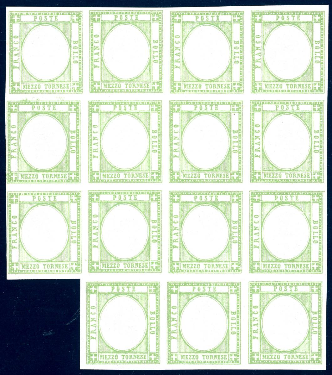 1861 - 1/2 tornese verde (17), blocco di 15 esemplari, gomma originale integra, perfetto e molto fresco. Ferrario. Ex coll. Imperato.