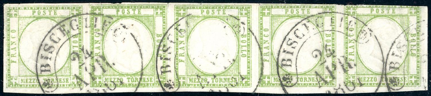 1861 - 1/2 tornese (17), striscia orizzontale di cinque, la massima possibile, tre esemplari con doppia effige ben discosta, tre esemplari perfetti, due intaccati in alto, usata a Bisceglie 24/4/1861. Rara. Cert. Ferrario. Ex coll. Imperato.