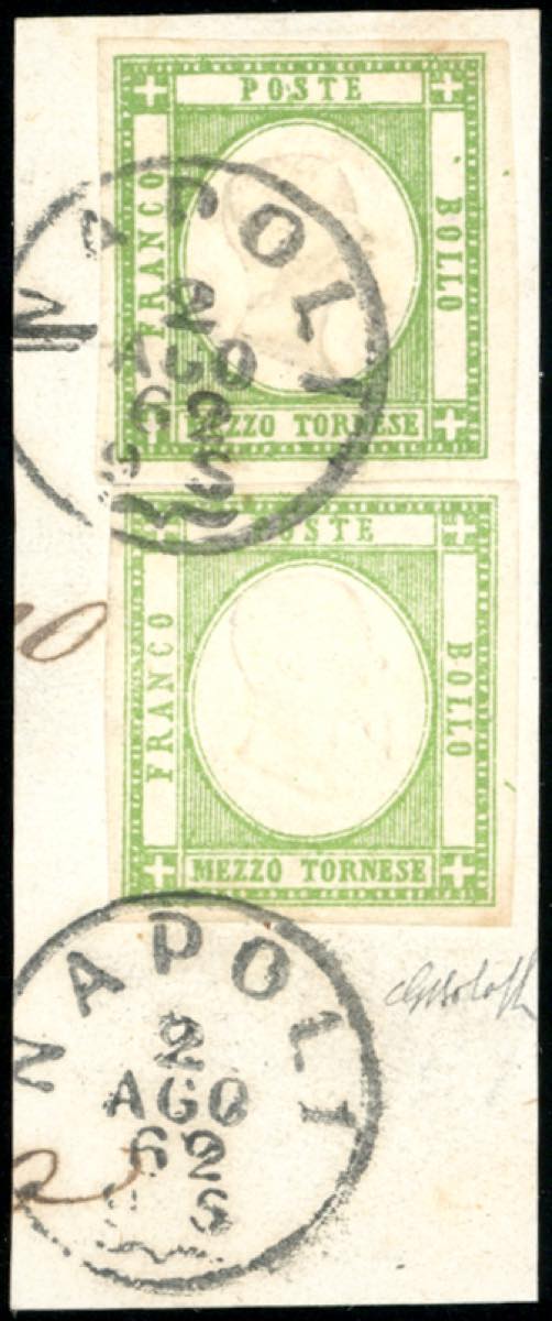 1861 - 1/2 tornese verde, 1/2 tornese verde giallo (17,17c), perfetti, usati su frammento a Napoli 2/8/1862. Bella combinazione di valori gemelli, di ottima qualità. G.Bolaffi. Ex coll. Imperato.