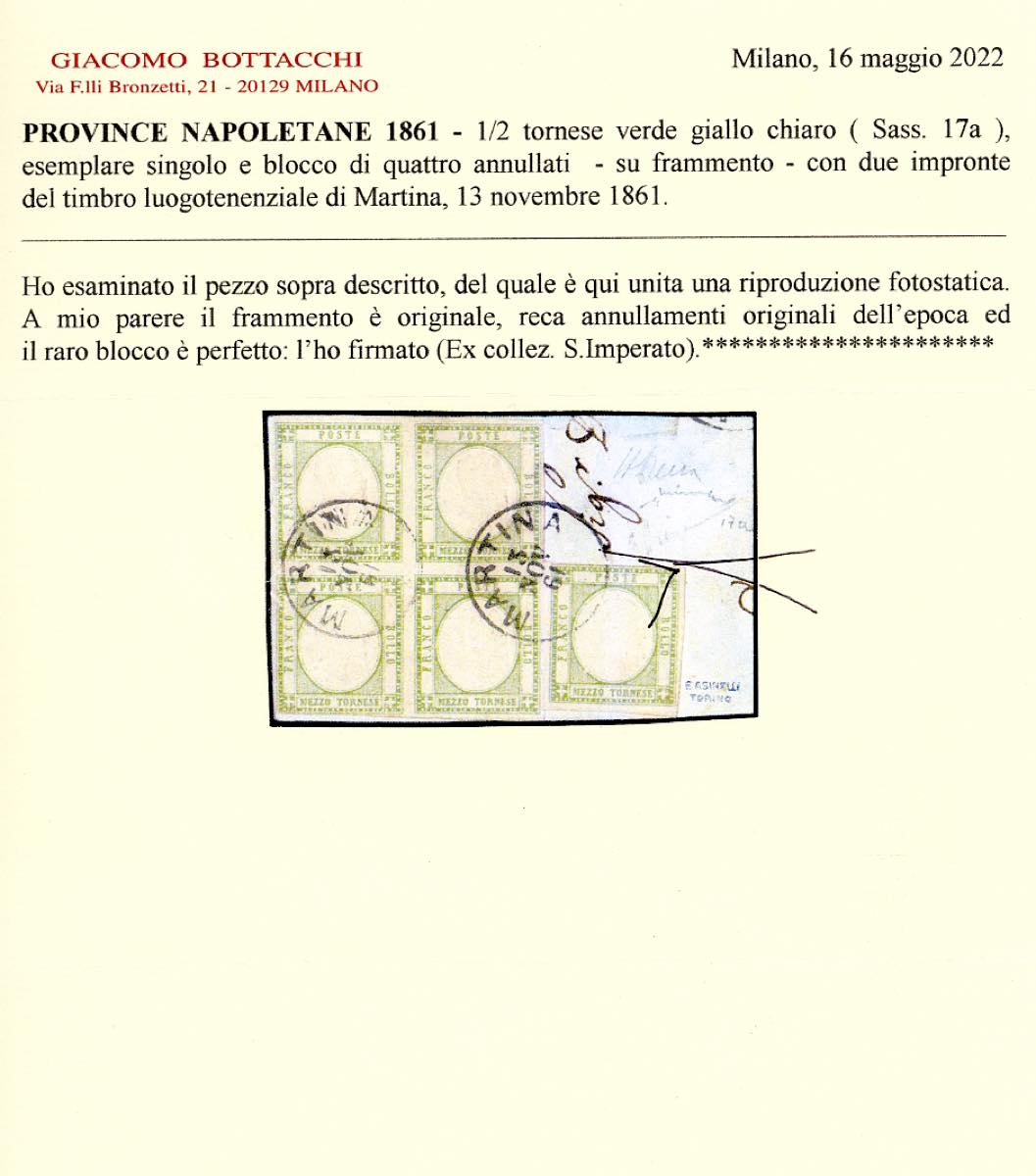 1861 - 1/2 tornese verde giallo chiaro (17a), blocco di quattro e singolo, perfetti, usato a Martina 13/11/1861. Estremamente raro. Em. e A.Diena, Chiavarello, cert. Bottacchi. Ex coll. Achillito Chiesa e Imperato.