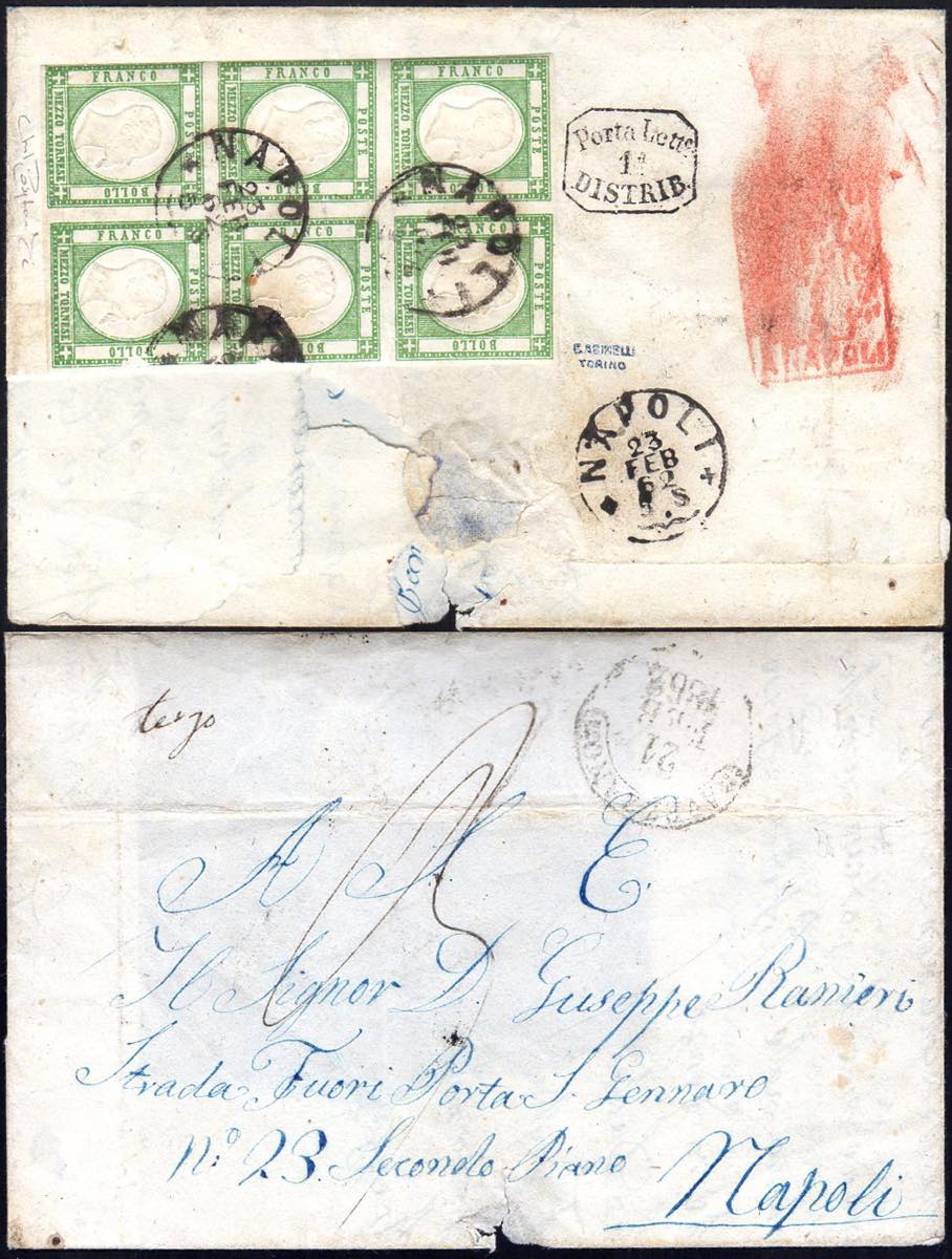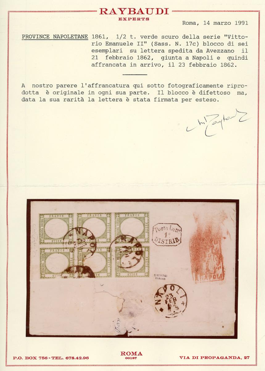 1862 - 1/2 tornese verde scuro (17c), blocco di sei esemplari, difetti, al verso di sovracoperta di lettera da Avezzano 21/2/1862 a Napoli, tassa 3 e manoscritto "tergo" ad indicare l'affrancatura al verso, in contrasto con la normativa postale. Si tratta del più grande blocco noto per questa tinta. Cert. Raybaudi (cat. Sassone € 450.000++ in proporzione).
