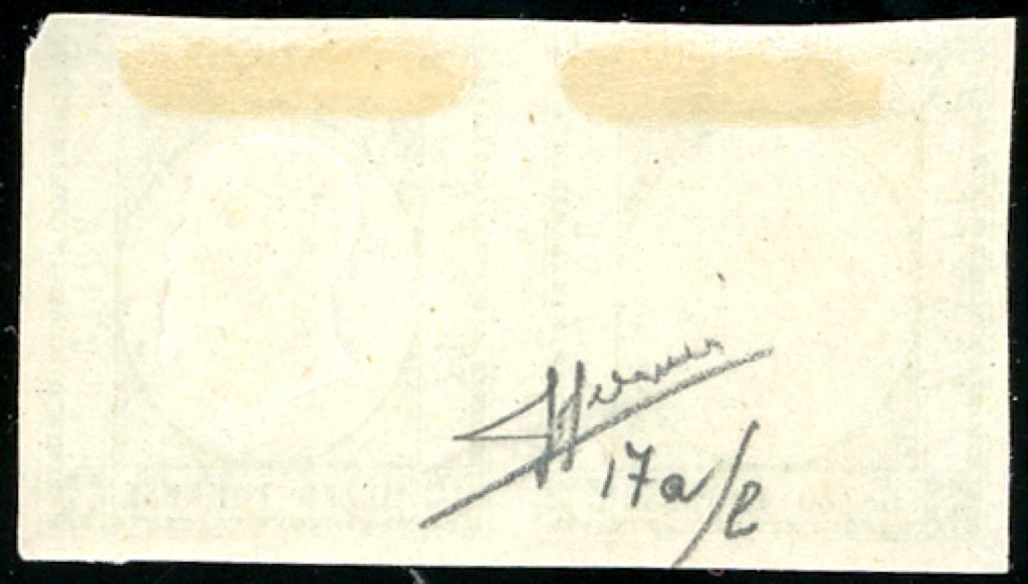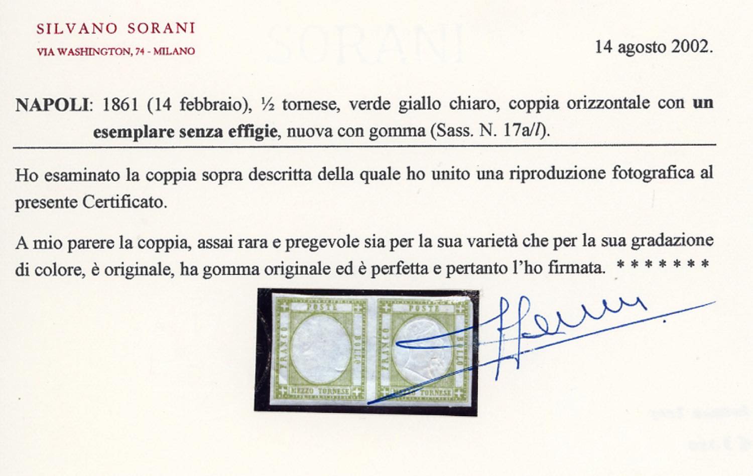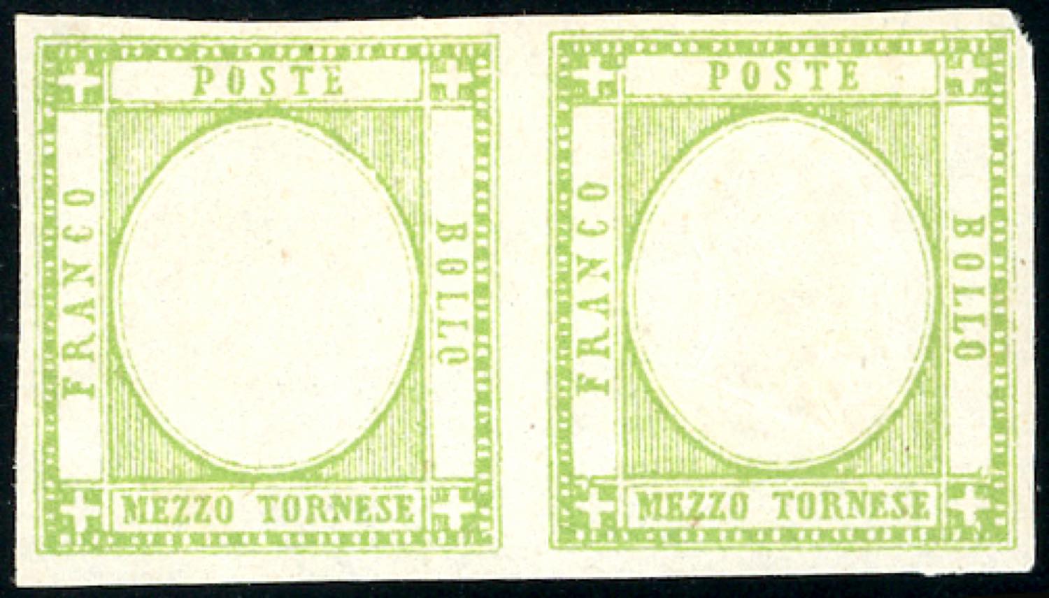 1861 - 1/2 tornese verde giallo chiaro, coppia orizzontale con un esemplare senza effigie (17a/l), gomma originale, perfetta. Tale gradazione di colore non è catalogata con questa varietà. RARISSIMA! Cert. Sorani. (Cat. Sassone € 100.000 in proporzione).