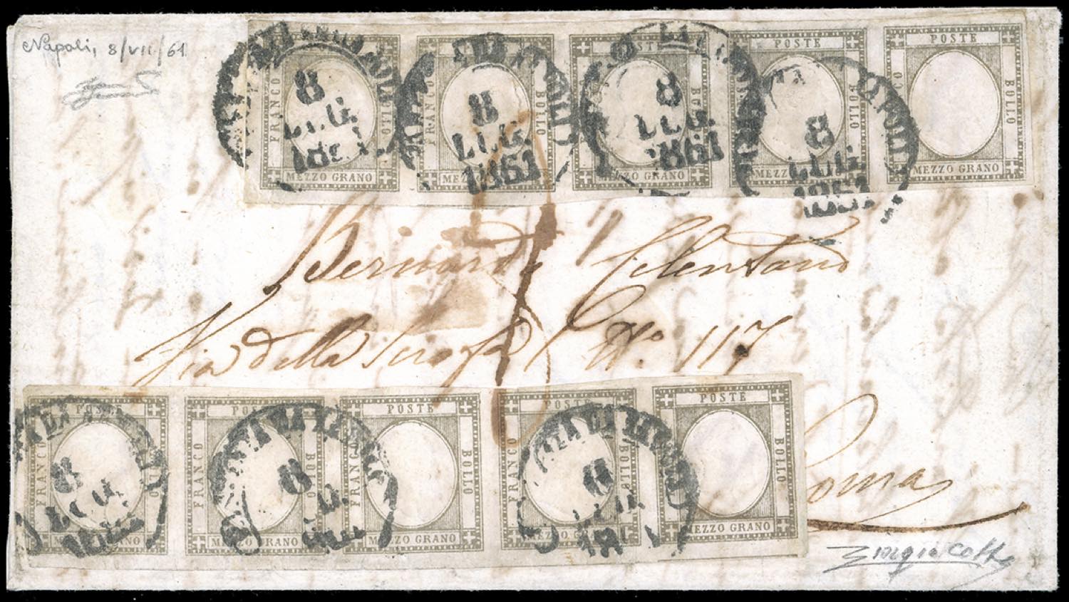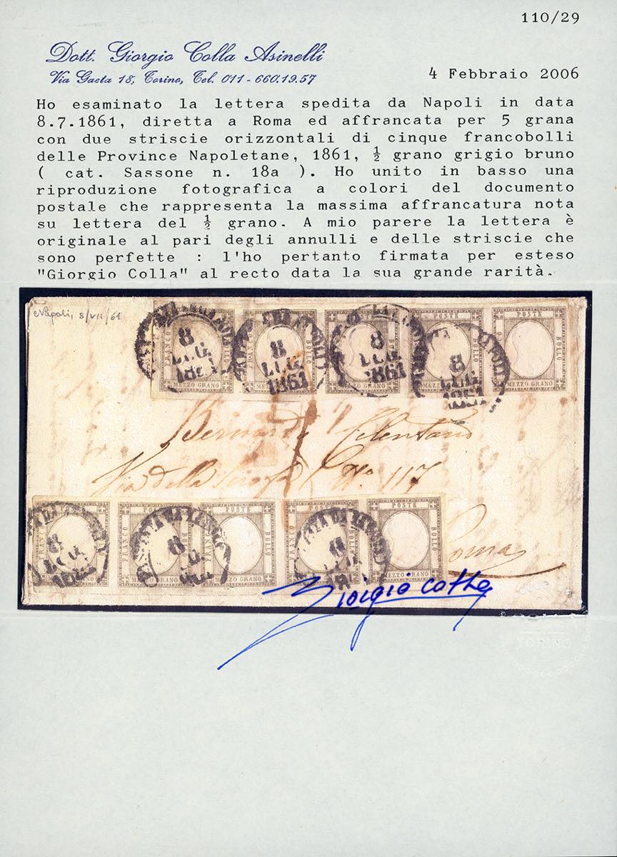 1861 - 1/2 grano grigio bruno (18a), due eccezionali strisce orizzontali di cinque, perfette, usate su fresca lettera "In partenza da Napoli 8 LUG. 1861" a Roma, tassata 8 baj in arrivo. E' LA MASSIMA AFFRANCATURA NOTA SU LETTERA DEL 1/2 GRANO, impreziosita dall'inusuale tinta. Grande rarità delle Province Napoletane. Cert. Ferrario e dettagliato certificato di Giorgio Colla, con firma per esteso.