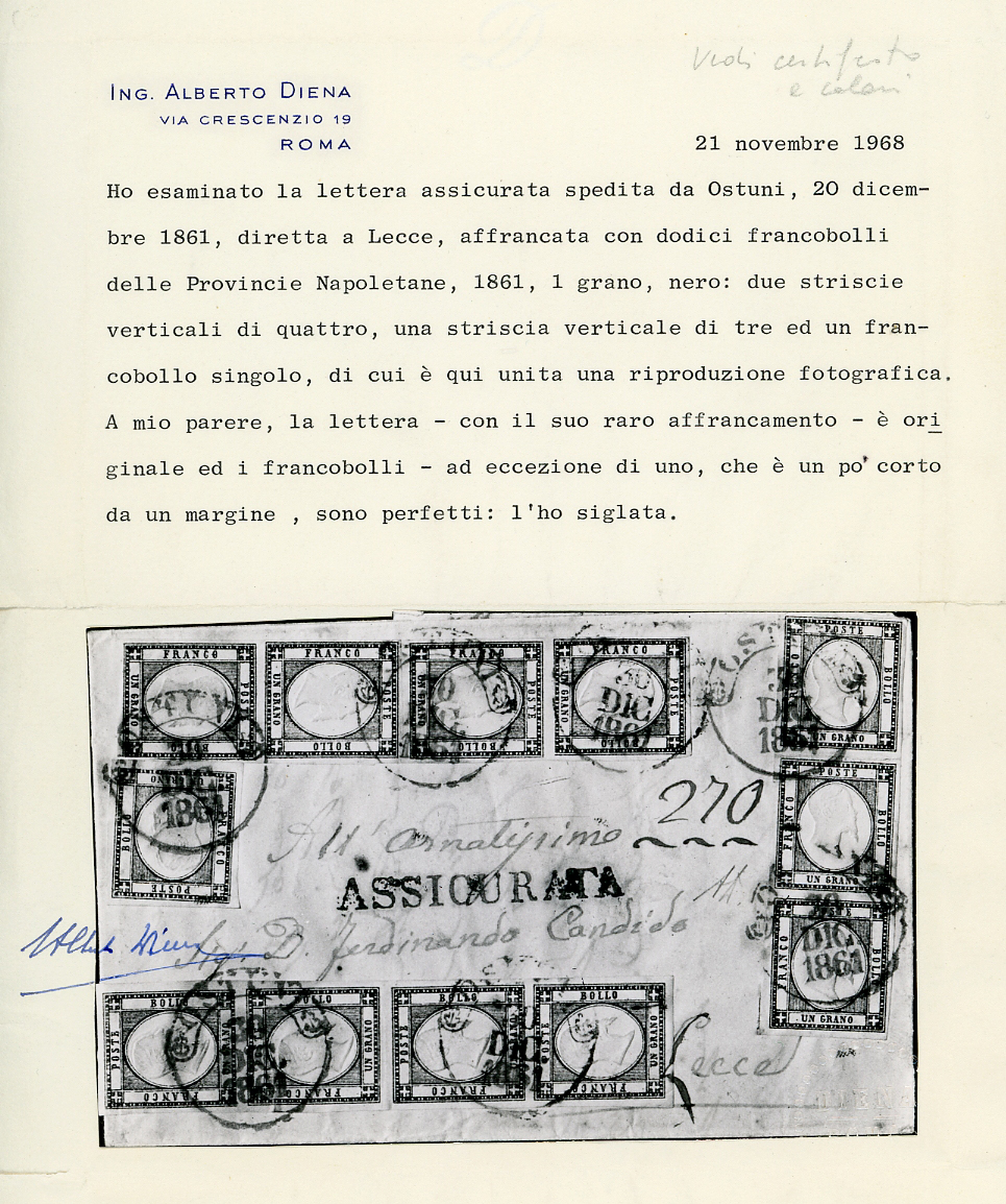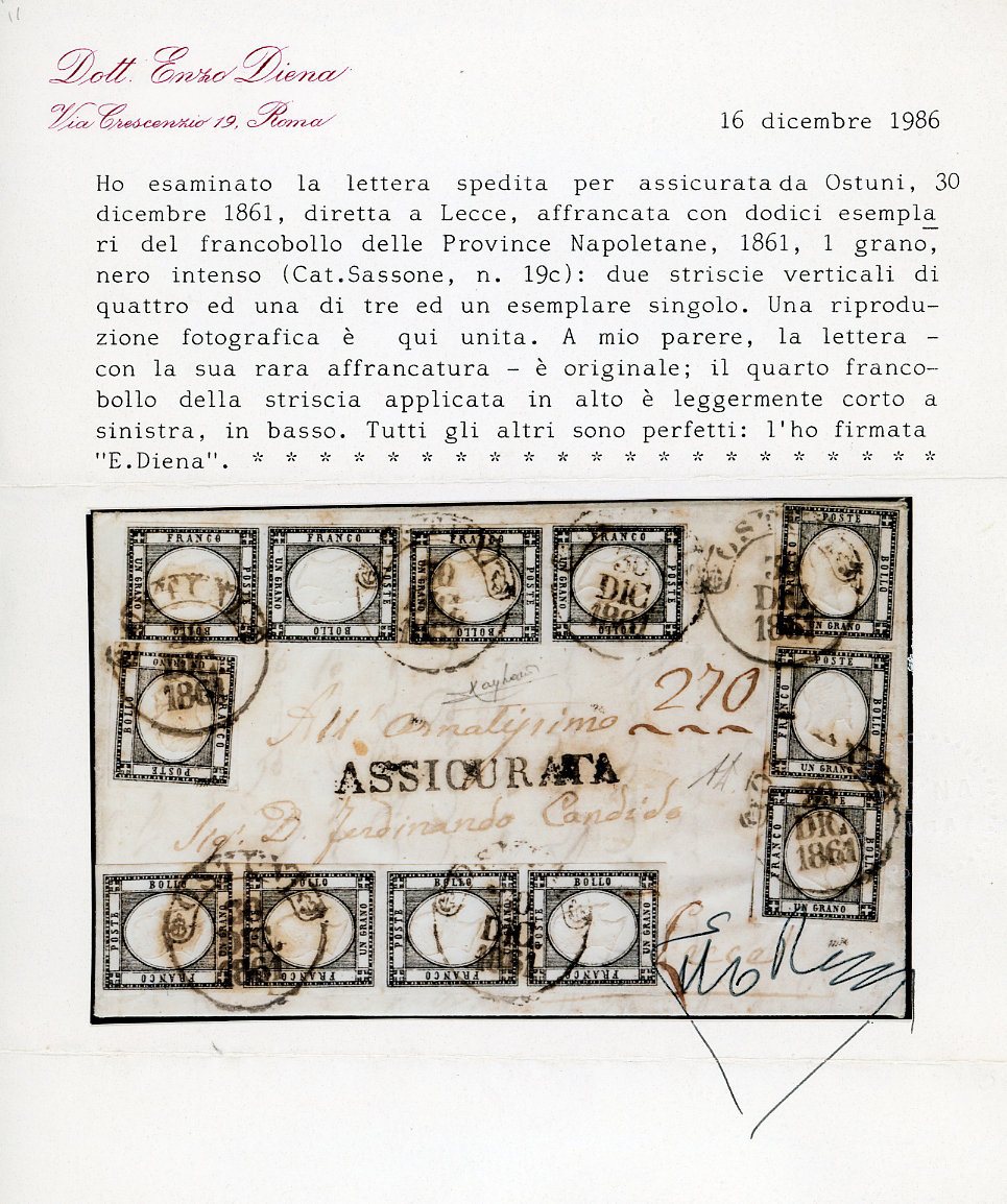1861 - 1/2 grano bruno grigiastro (18c), margini da ampi a giusti, isolato su fascetta completa di giornale da Chieti 15/6/1861 a Napoli. Rara e di eccezionale aspetto. E.Diena. Ex coll. Imperato.