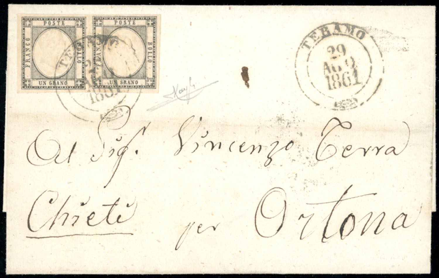 1861 - 1 grano nero (19), coppia orizzontale con effigi molto disallineate, perfetta, su sovracoperta di lettera da Teramo 29/8/1861 a Ortona. Raybaudi. Ex coll. Imperato.