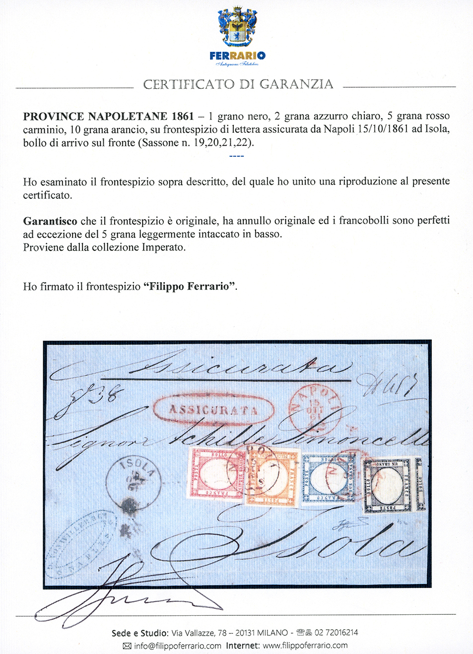 1861 - 1 grano nero, 2 grana azzurro chiaro, 5 grana rosso carminio, 10 grana arancio (19,20,21,22), perfetti ad eccezione del 5 grana leggermente intaccato in basso, molto freschi, su frontespizio di lettera assicurata da Napoli 15/10/1861 ad Isola, bollo di arrivo sul fronte. Affrancatura quadricolore molto rara, di ottimo aspetto. Affrancatura quotata dal Sassone solo su frammento € 24.000. Cert. Ferrario. Ex coll. Imperato.