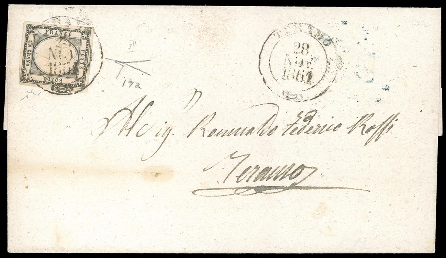 1861 - 1 grano grigio nero (19a), doppia effigie ben discosta e molto evidente, perfetto, isolato su lettera da Teramo 28/11/1861 per città. Bottacchi, Chiavarello. Ex coll. Imperato.