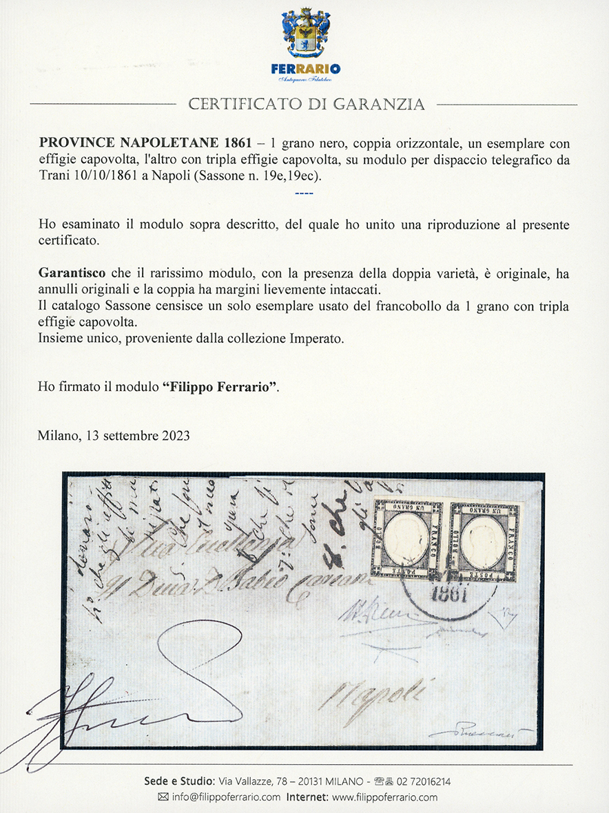 1861 - 1 grano nero, coppia orizzontale, UN ESEMPLARE CON EFFIGIE CAPOVOLTA, L'ALTRO CON TRIPLA EFFIGIE CAPOVOLTA (19e,19ec), su modulo per dispaccio telegrafico da Trani 10/10/1861 a Napoli. Eccezionale rarità dell'emissione, certamente unica per la presenza della doppia varietà. Il catalogo Sassone censisce un solo esemplare usato del francobollo da 1 grano con tripla effigie capovolta. Da esposizione. Alberto ed Enzo Diena, Chiavarello, tutti per esteso, Vaccari, cert. Bottacchi e Ferrario.