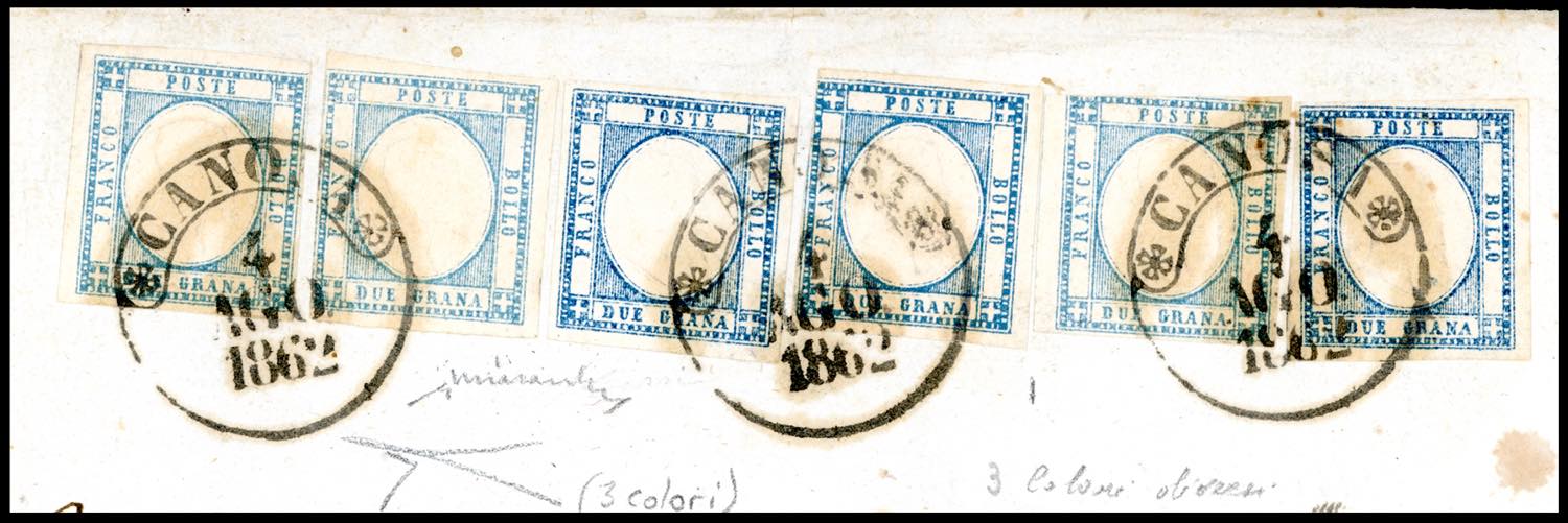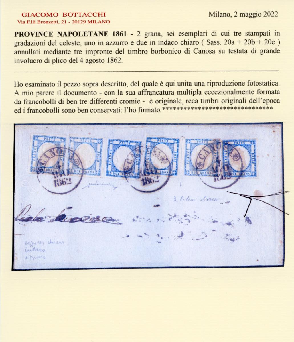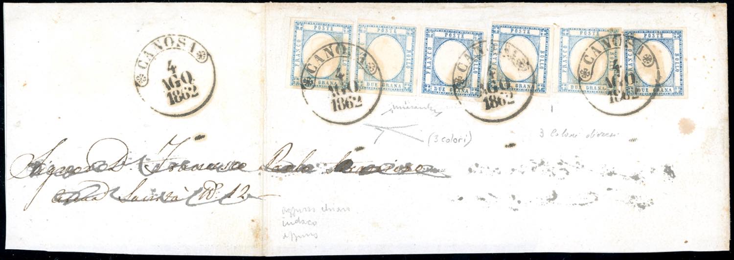 1862 - 2 grana, sei esemplari di colori differenti, tre in gradazione celeste, uno azzurro, due indaco chiaro (20a,20b,20e), lievi difetti di marginatura in alcuni francobolli, su testata di grande involucro di plico da Canosa 4/8/1862. Eccezionale affrancatura multipla formata da francobolli gemelli di tre differenti cromie. Insieme unico! Chiavarello, cert. Bottacchi. Ex coll. Imperato.