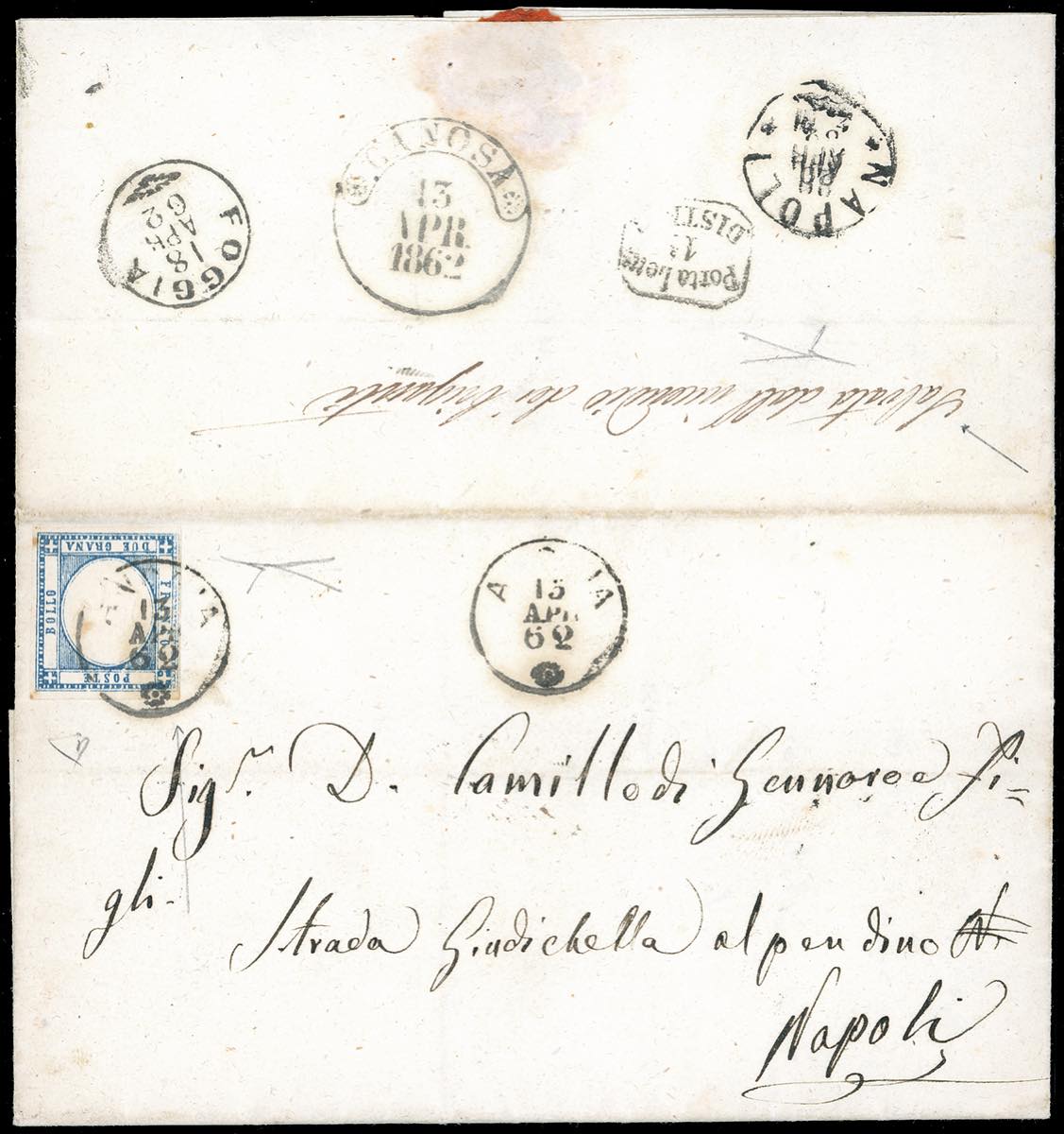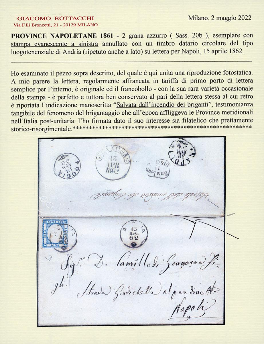 1862 - 2 grana azzurro, varietà STAMPA EVANESCENTE A SINISTRA (20b), su fresca lettera da Andria 13/4/1862 a Napoli. Al verso è riportata l'indicazione manoscritta "Salvata dall'incendio dei briganti", testimonianza del brigantaggio che all'epoca affliggeva le Province meridionali dell'Italia post-unitaria. Di eccezionale interesse storico. E.Diena, dettagliato cert. Bottacchi. Ex coll. Imperato.