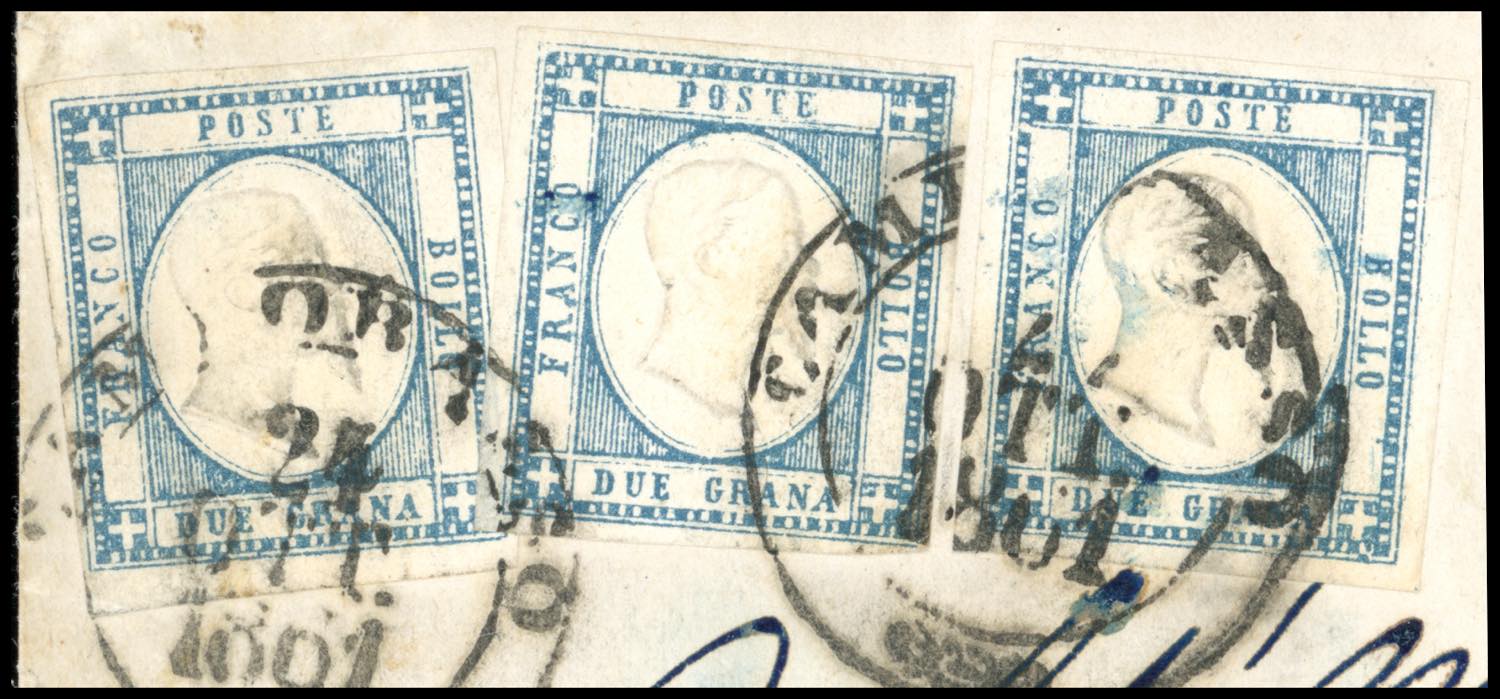 1861 - 2 grana azzurro ardesia (20c), tre esemplari, due dei quali con interessanti macchie di colore, perfetti, su sovracoperta di lettera da Campobasso 24/10/1861 a Napoli. Non comune! Chiavarello. Ex coll. Imperato. Cert. Ferrario.