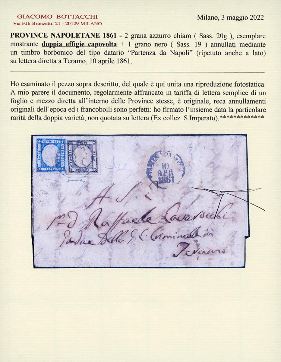 1861 - 2 grana azzurro chiaro, DOPPIA EFFIGIE CAPOVOLTA, ben discosta, 1 grano nero (20g,19), perfetti, su lettera da Napoli 10/4/1861 a Teramo. Varietà molto rara su busta, non quotata dal catalogo Sassone. Emilio ed Enzo Diena, Chiavarello, cert. Bottacchi. Ex coll. Imperato.